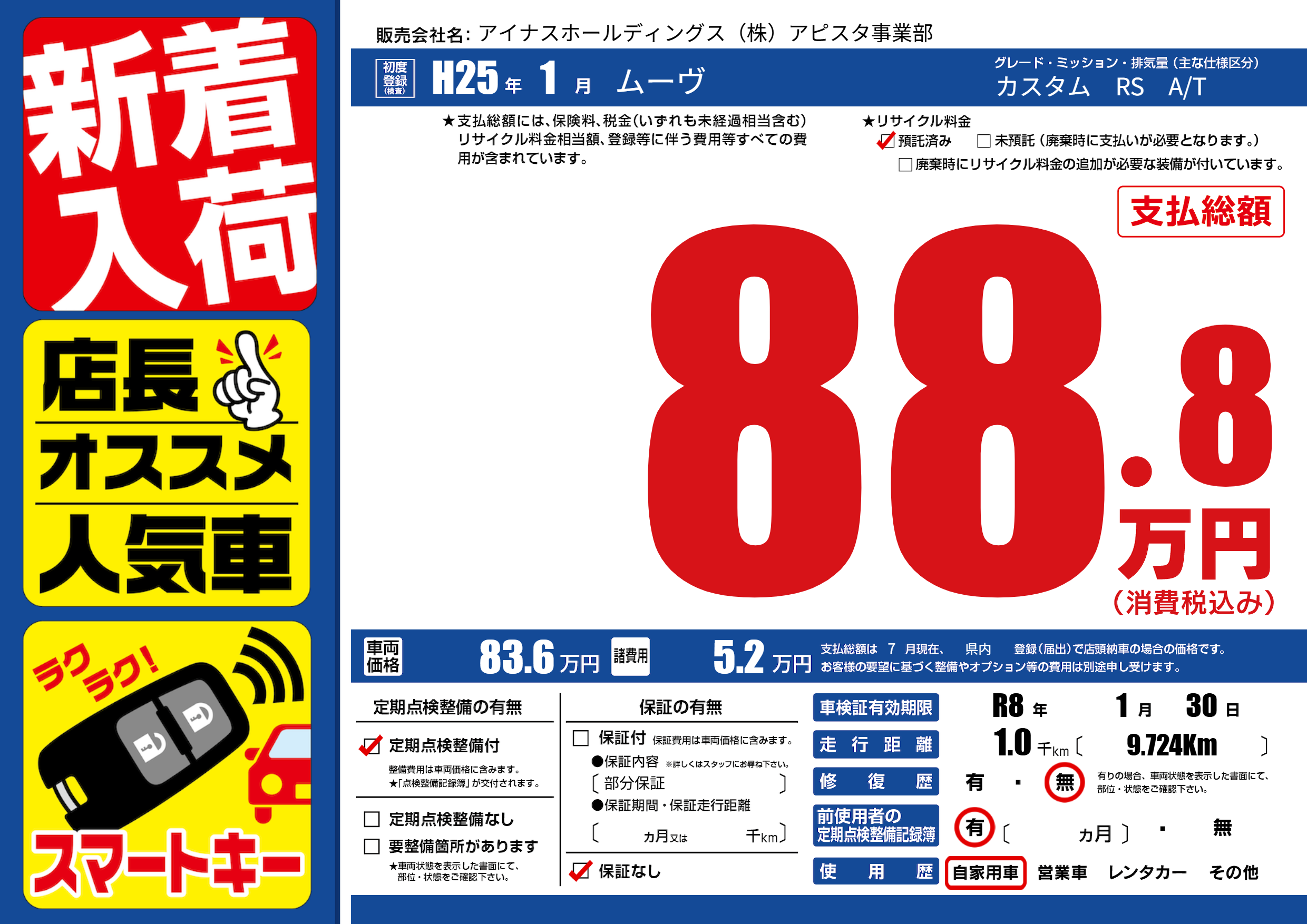 | 走行キロ | 0.1万km | 初年度登録 | H25年1月 |