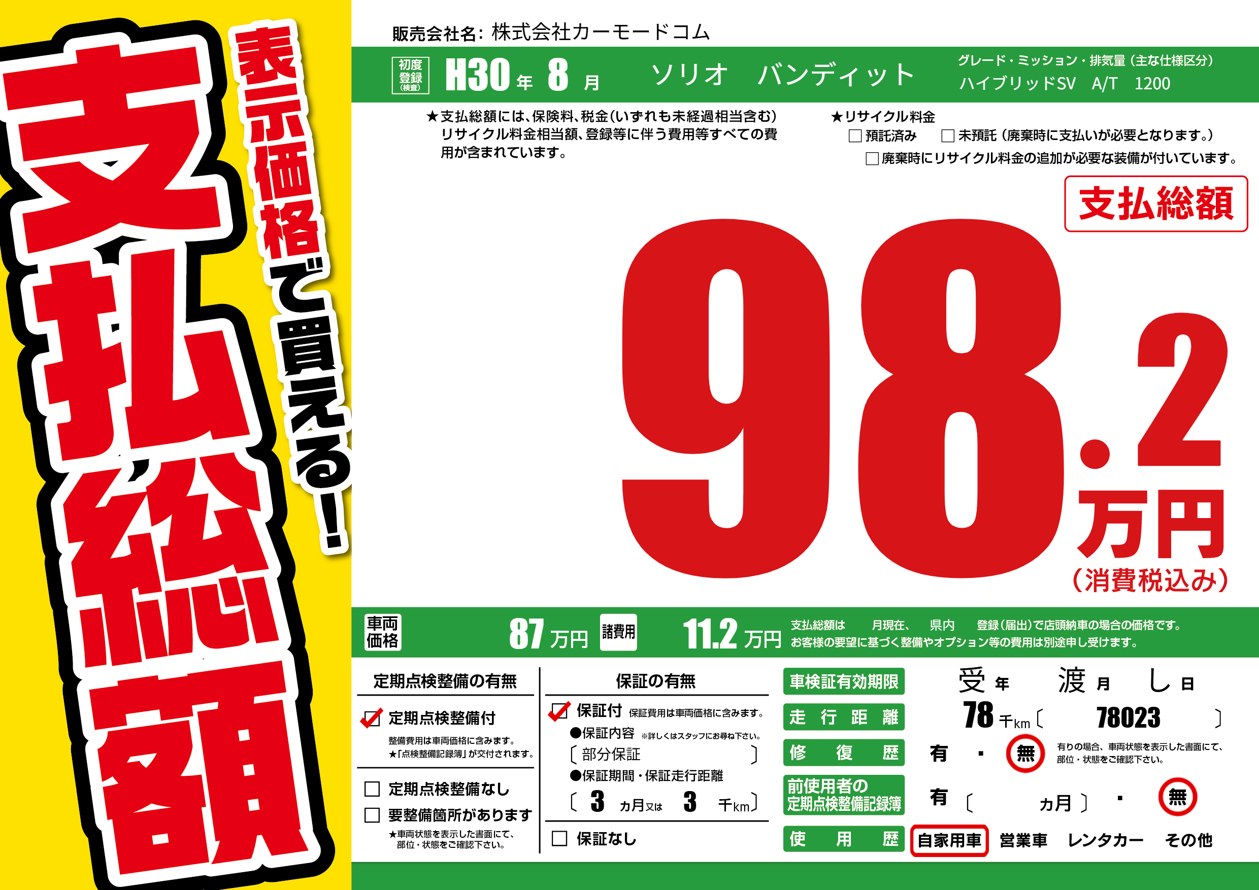 保証付き 保証内容(部分保証) 3ヶ月または(3)千kmまで |