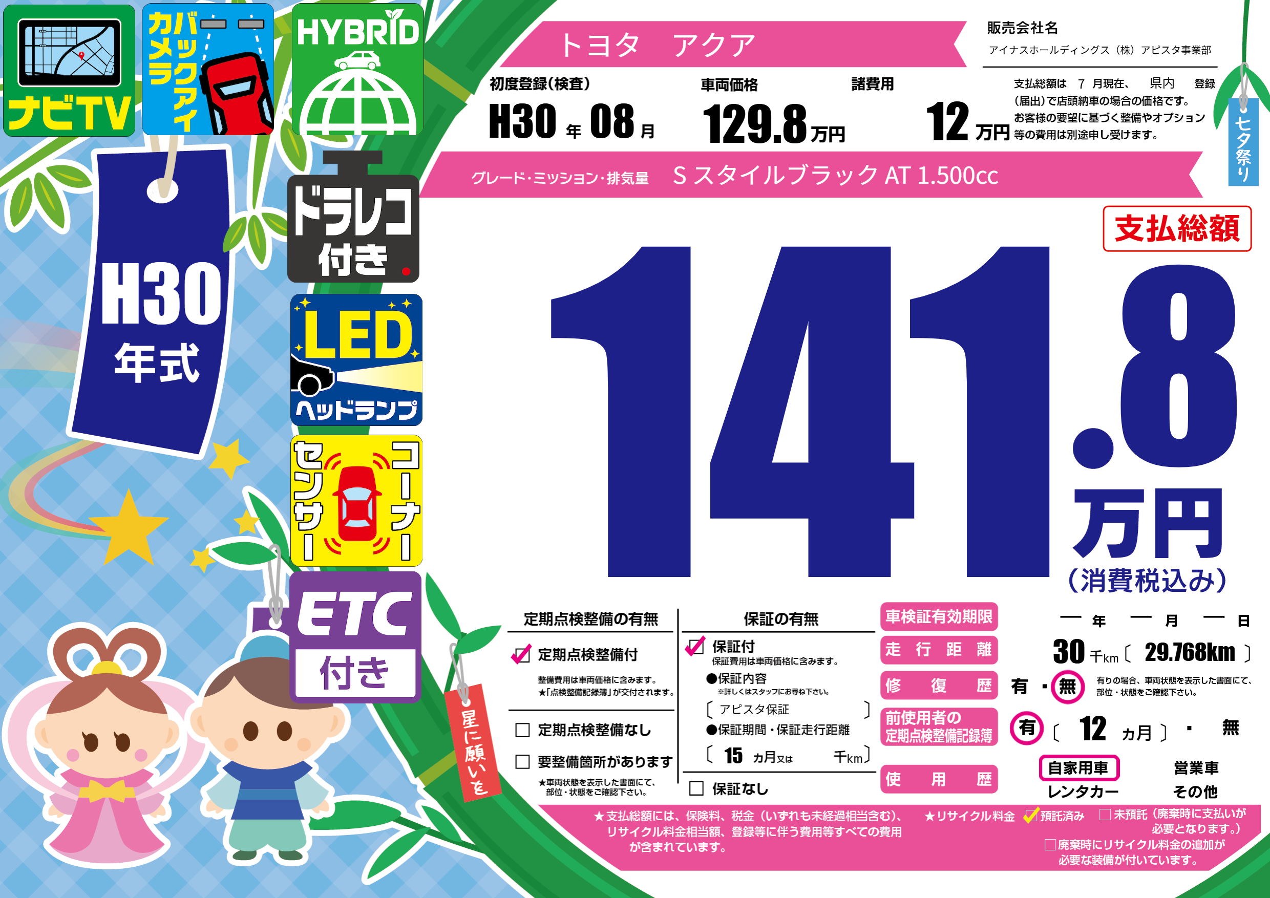 | 走行キロ | 3万km | 初年度登録 | H30年08月 |