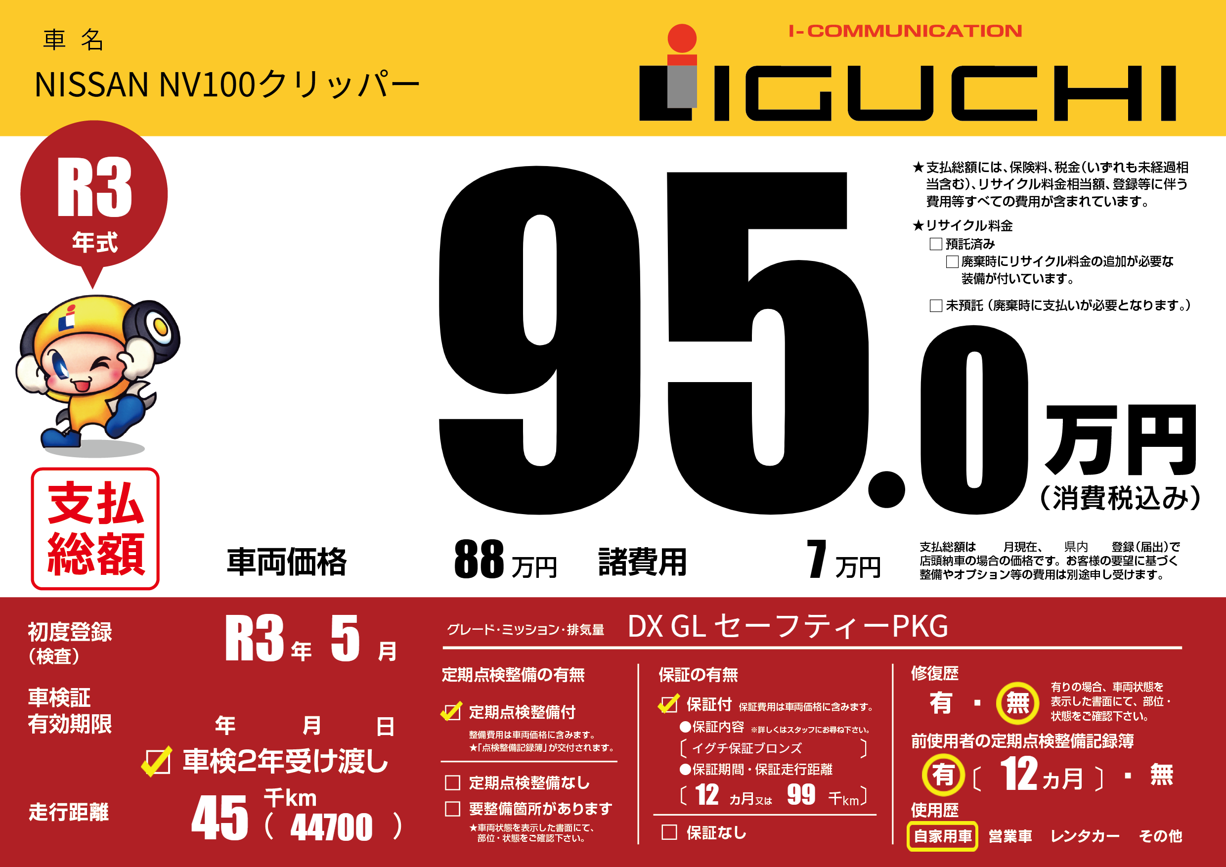 保証付き 保証内容(イグチ保証ブロンズ) 12ヶ月または(99)千kmまで |