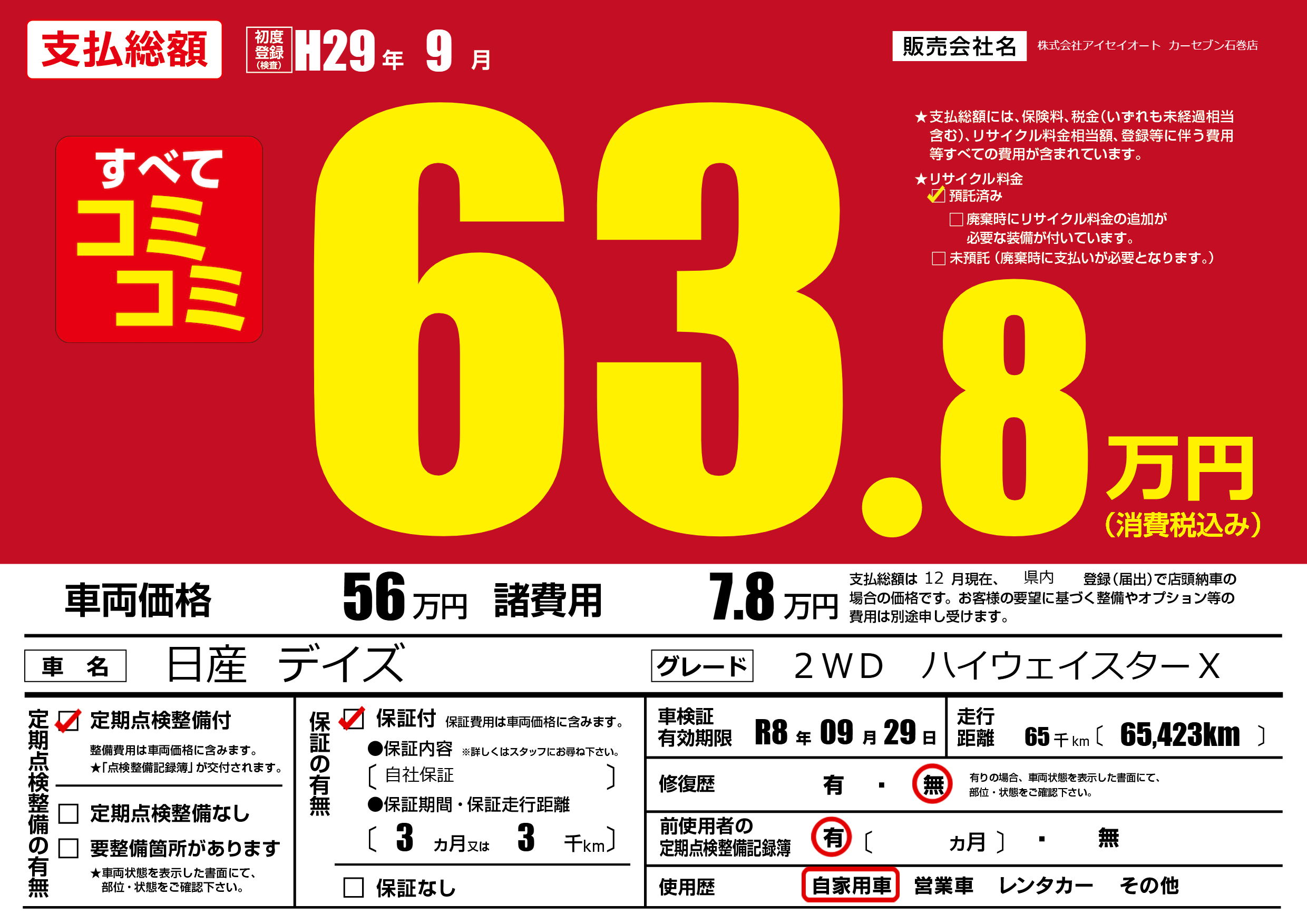 | 走行キロ | 6.5万km | 初年度登録 | H29年9月 |