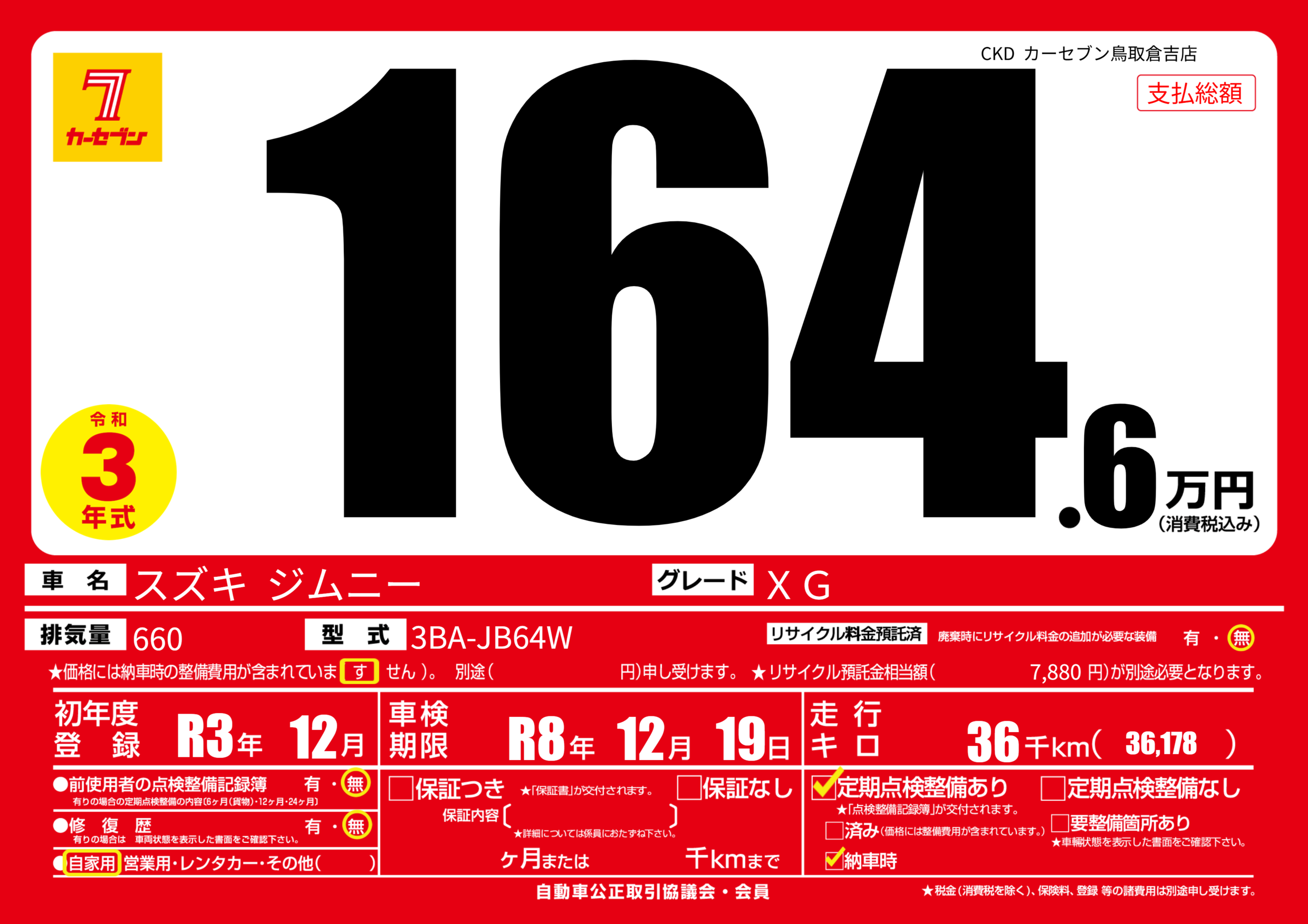 | 走行キロ | 3.6万km | 初年度登録 | R3年12月 |