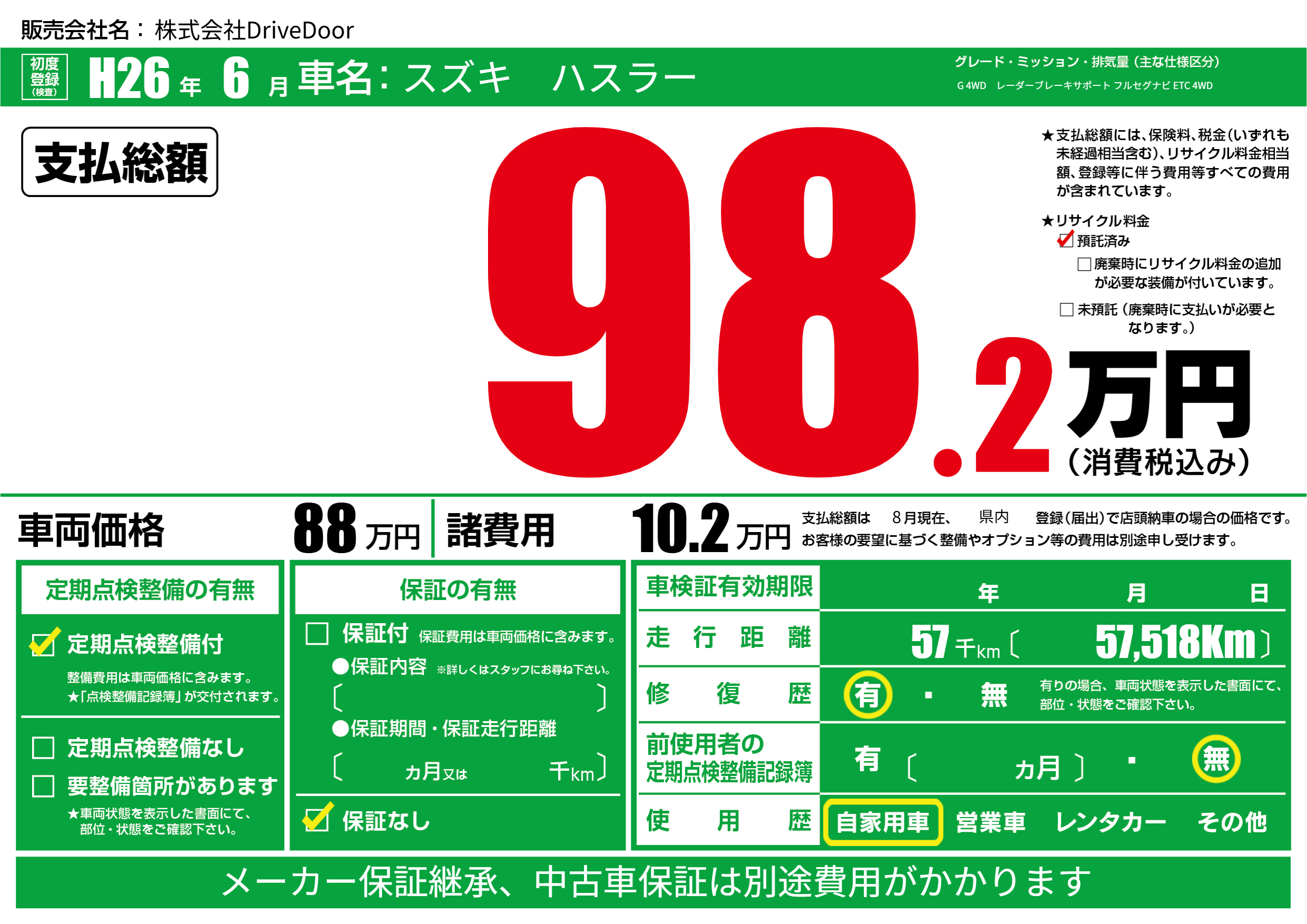 あり | リサイクル預託金相当額 | ( 0円)が別途必要 |