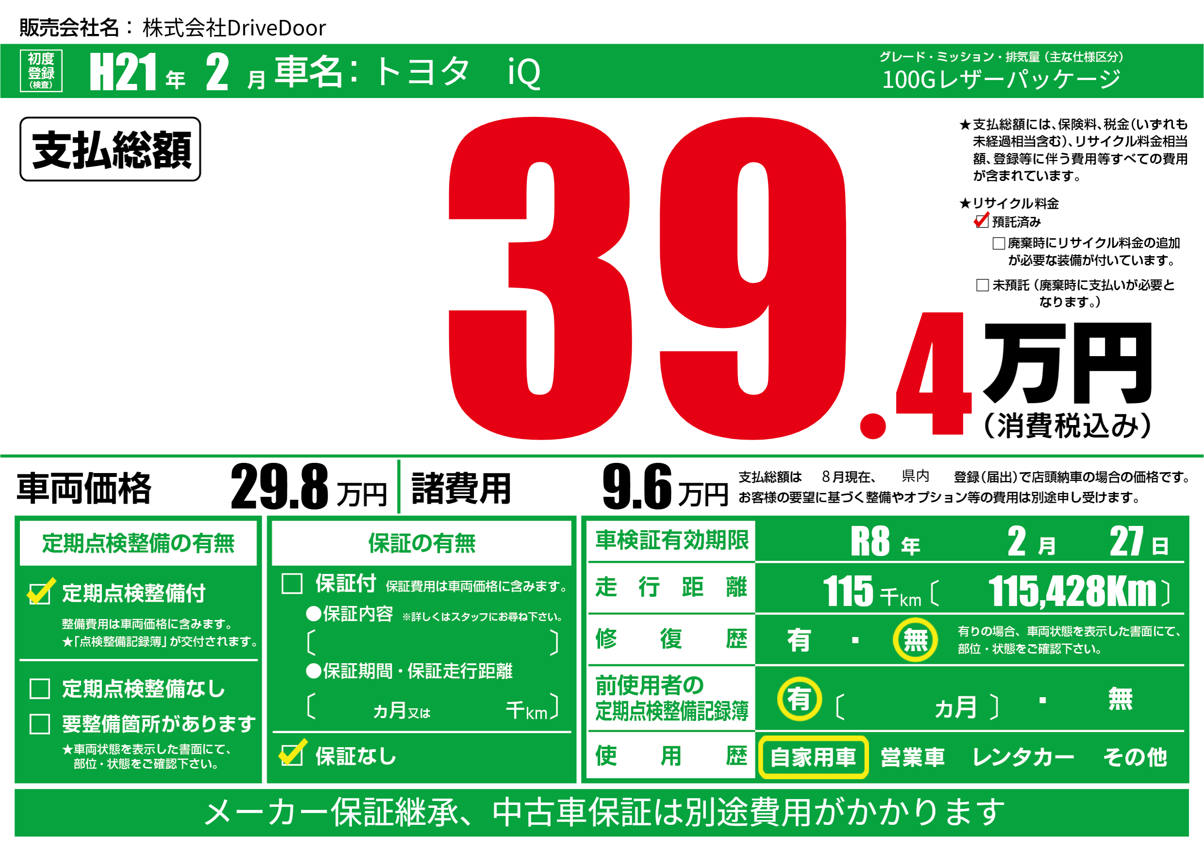 | 車名 | トヨタ iQ | グレード ミッション 排気量 |