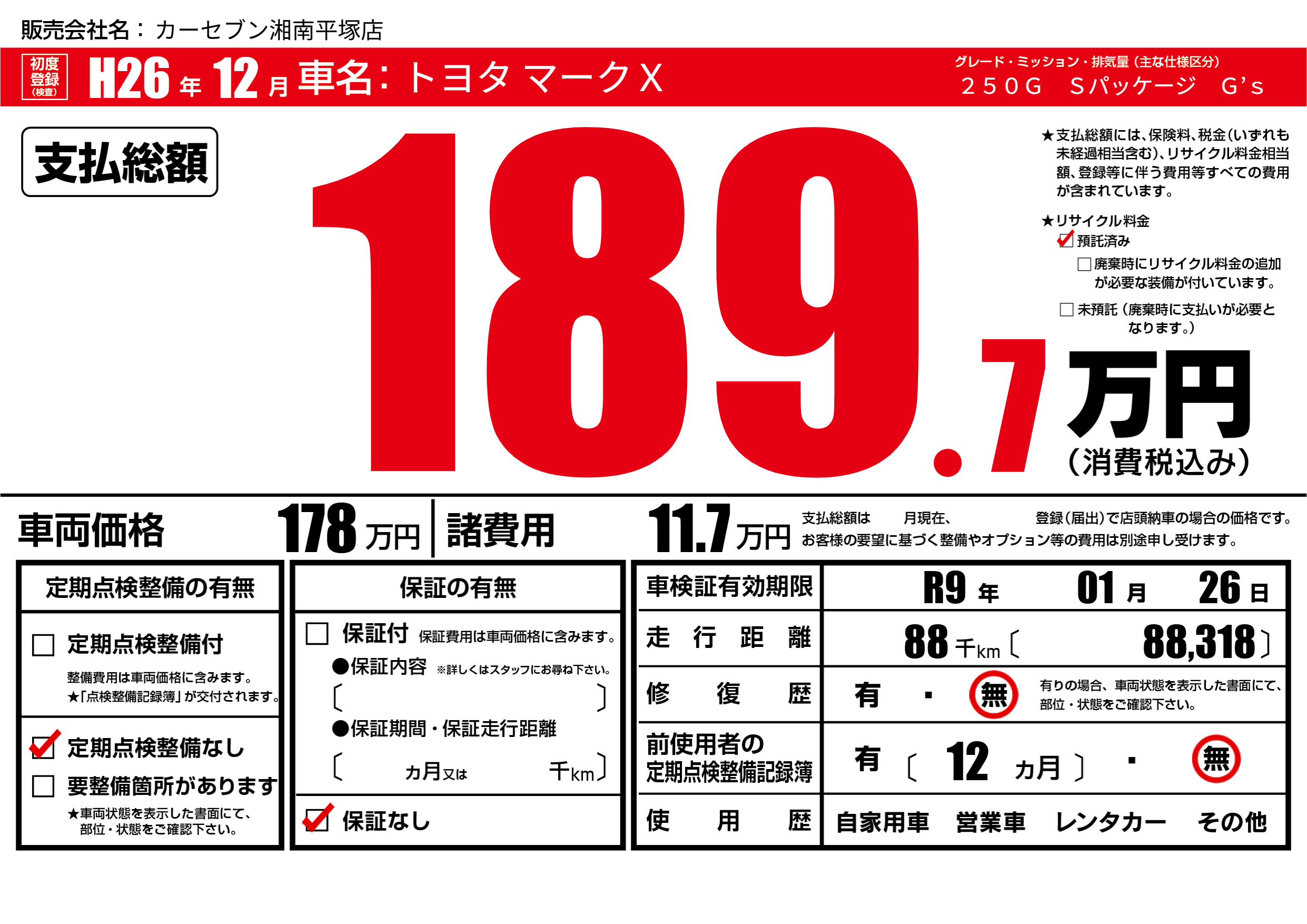 | 車検制限 | R9年 01月 26日 | ||