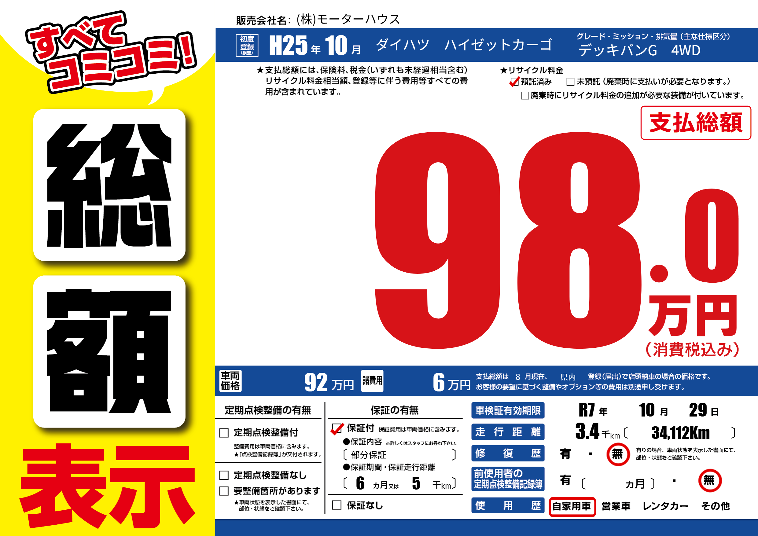 | 走行キロ | 0.3万km | 初年度登録 | H25年10月 |