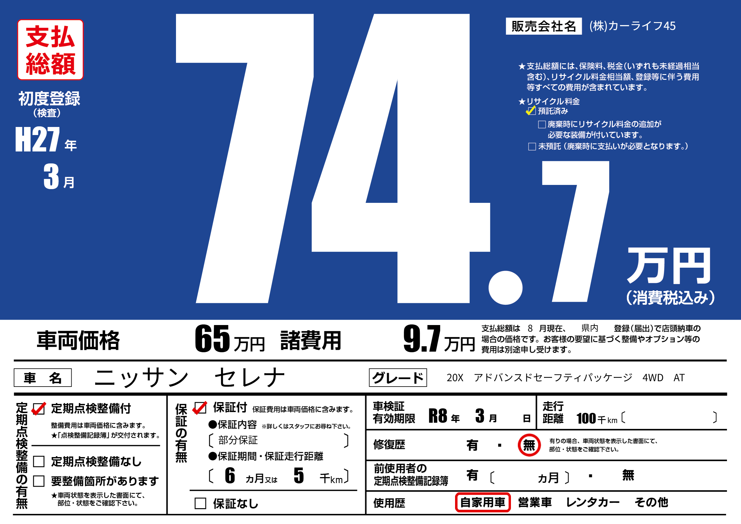 | 走行キロ | 10万km | 初年度登録 | H27年3月 |