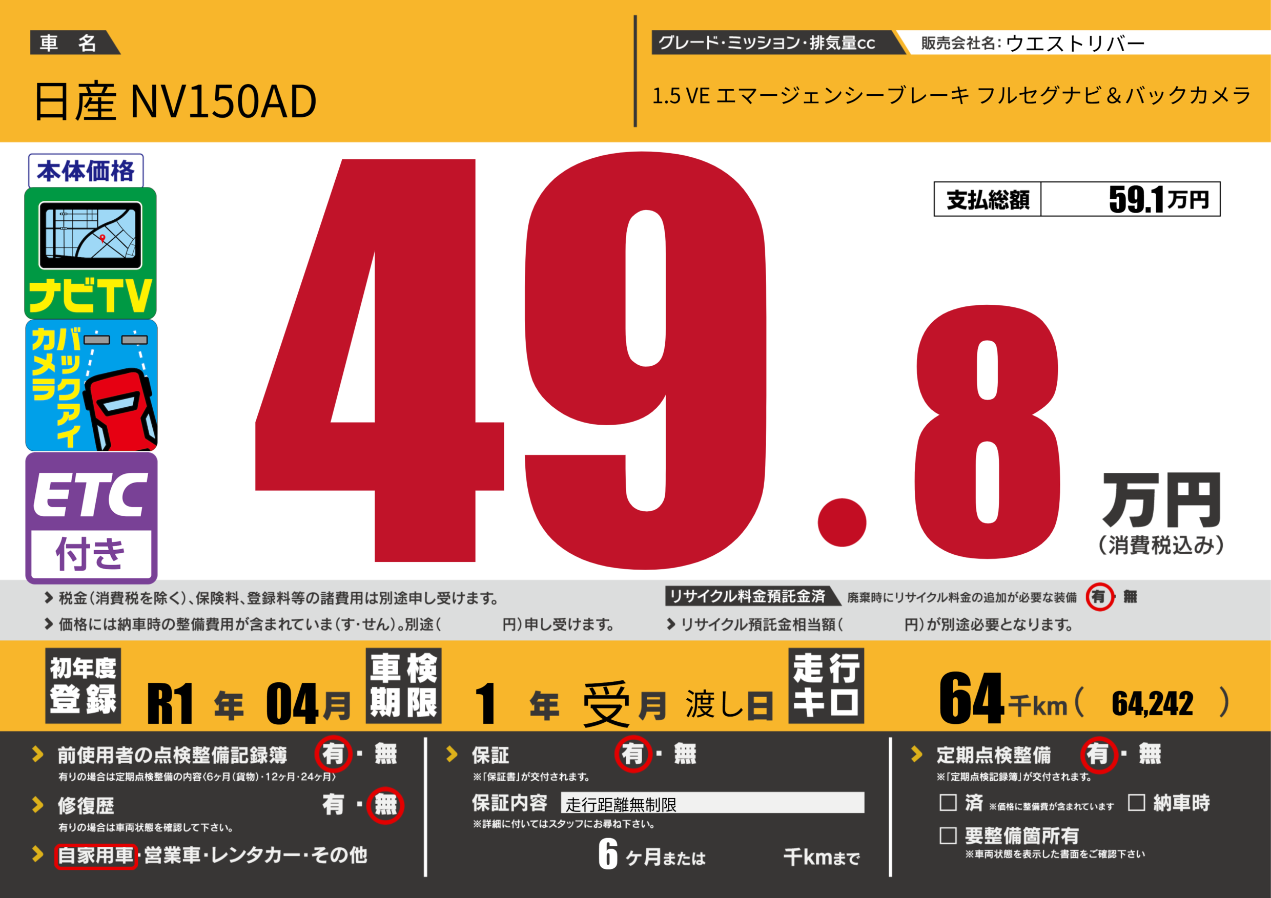 | 車名 | 日産 NV150AD | グレード ミッション 排気量 |