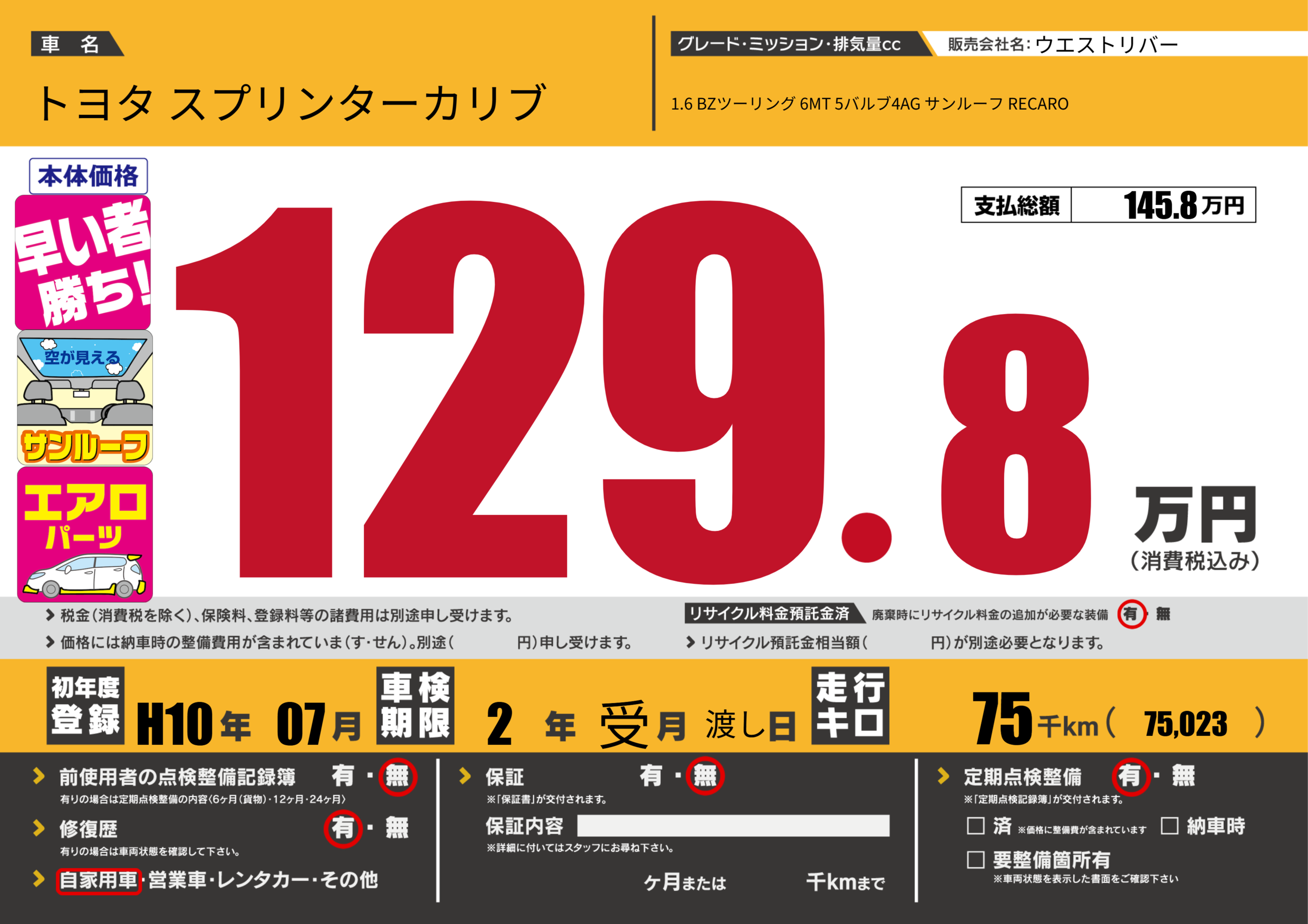 | 走行キロ | 7.5万km | 初年度登録 | H10年07月 |