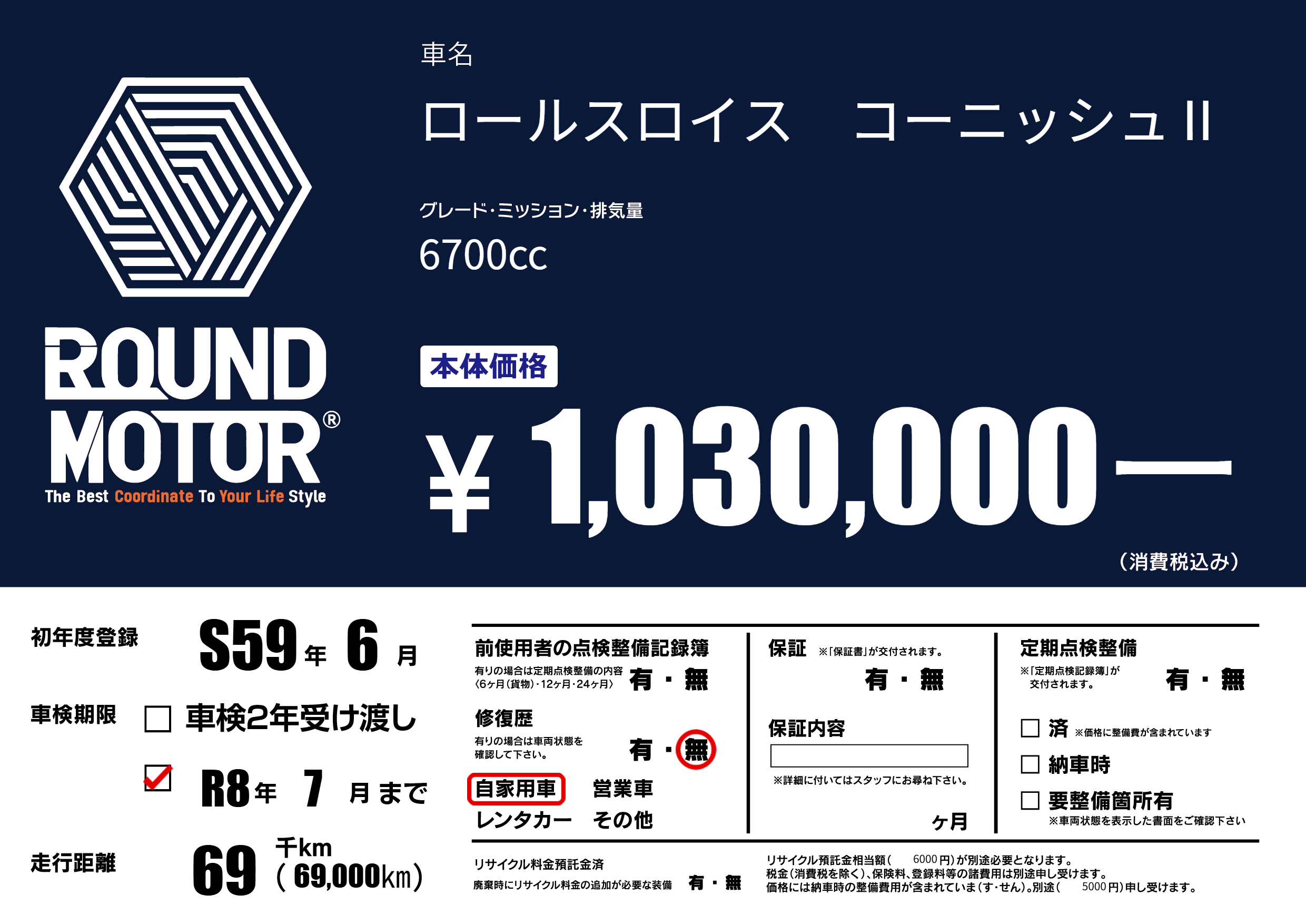 | 車名 | ロールスロイス コーニッシュⅡ | グレード ミッション 排気量 |
