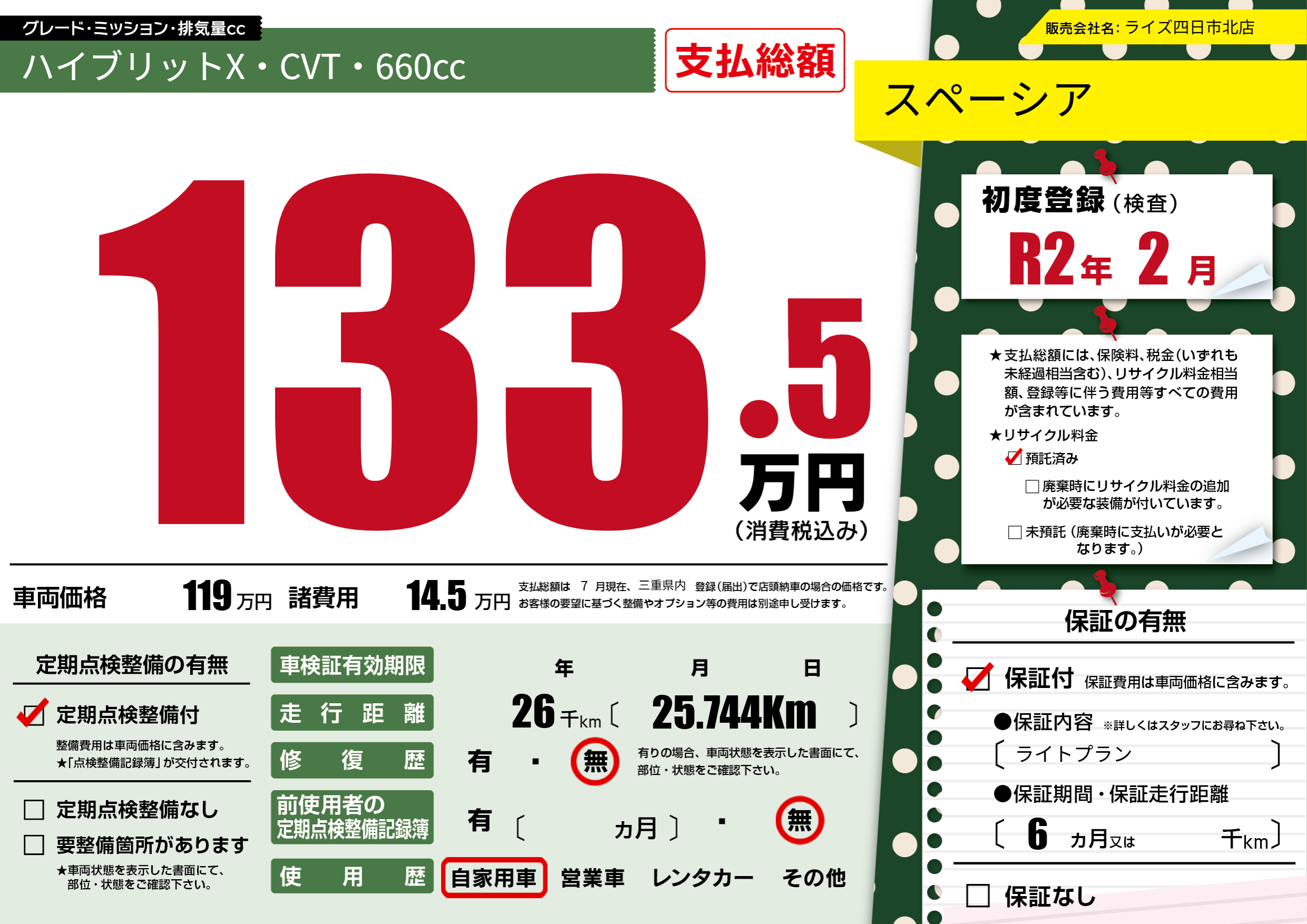 | 車名 | スペーシア | グレード ミッション 排気量 |