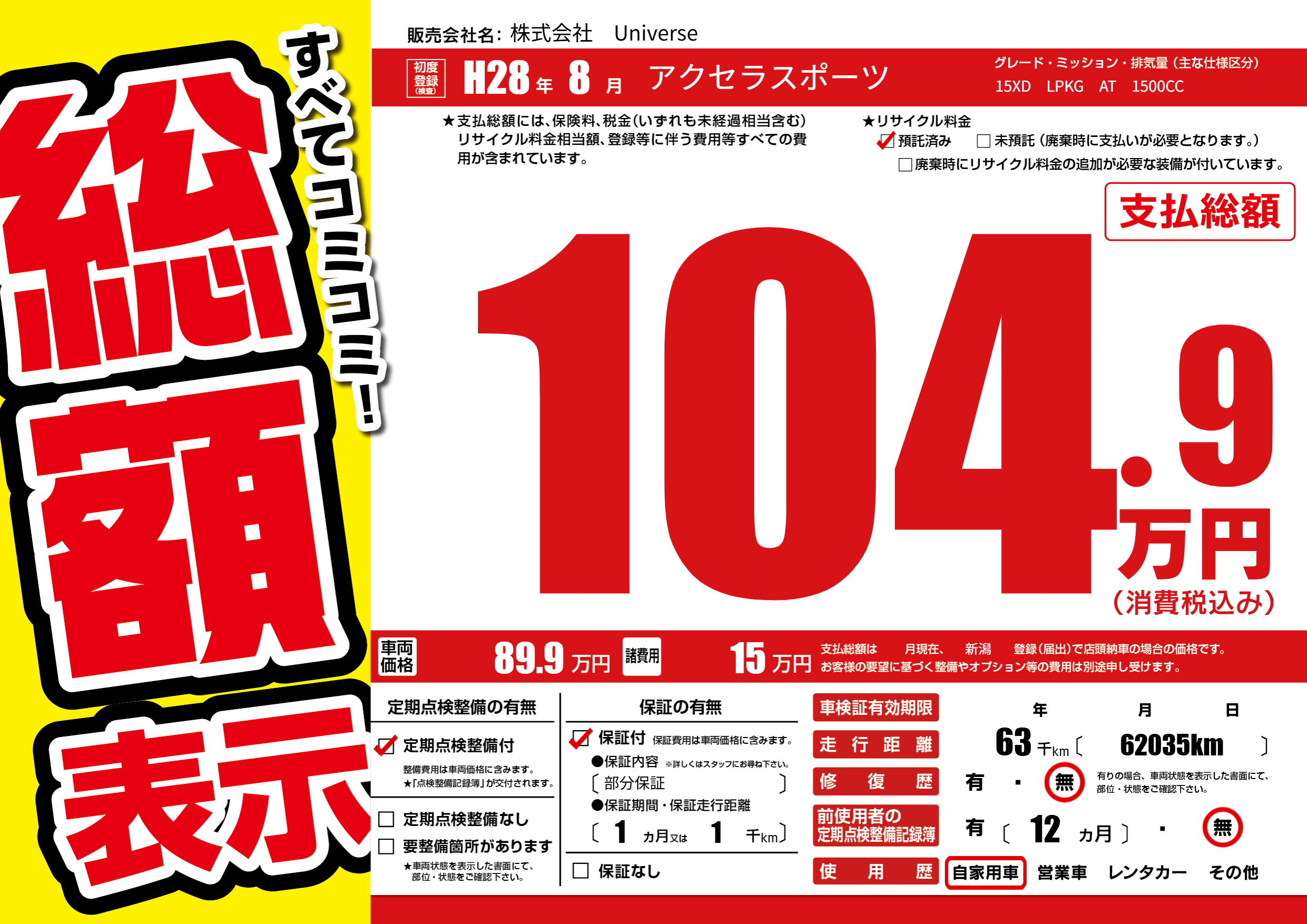 | 車名 | アクセラスポーツ | グレード ミッション 排気量 |
