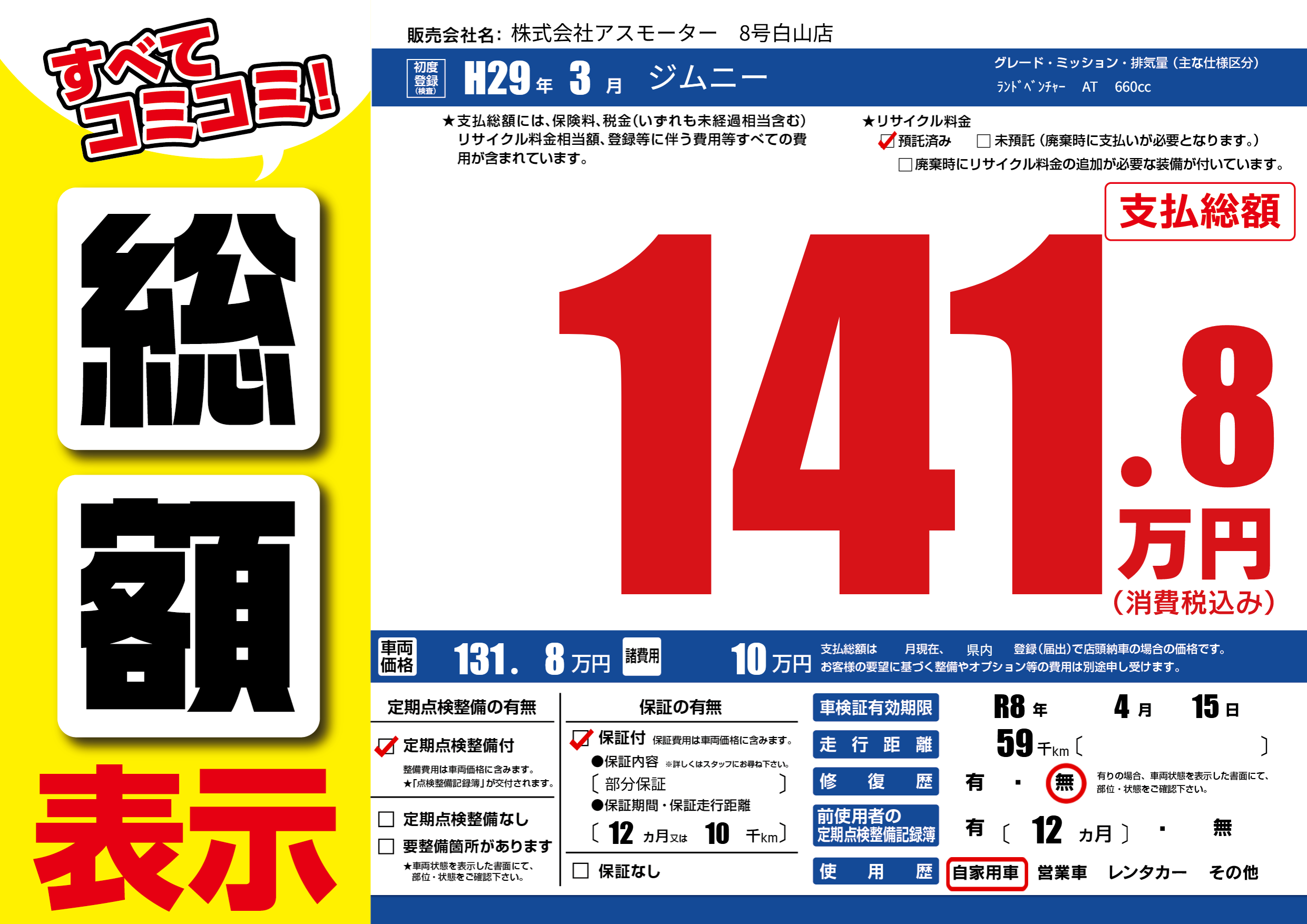 | 車検制限 | R8年 4月 15日 | ||
