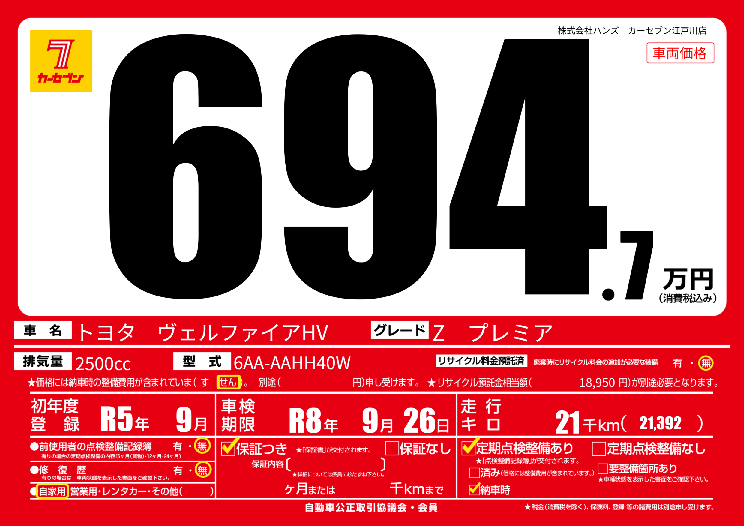 | 車名 | トヨタ ヴェルファイアHV | グレード ミッション 排気量 |