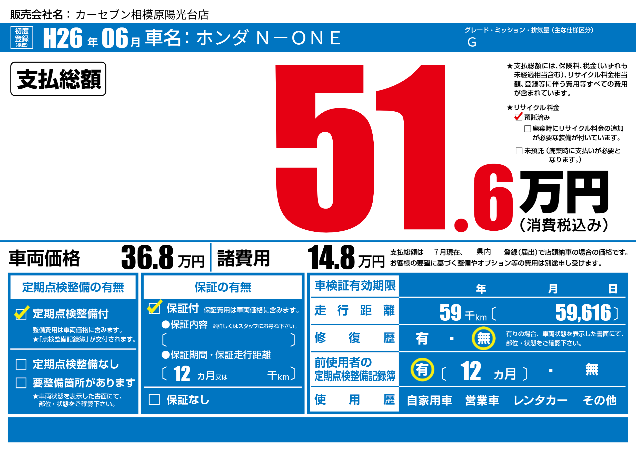 | 車名 | ホンダ N-ONE | グレード ミッション 排気量 |