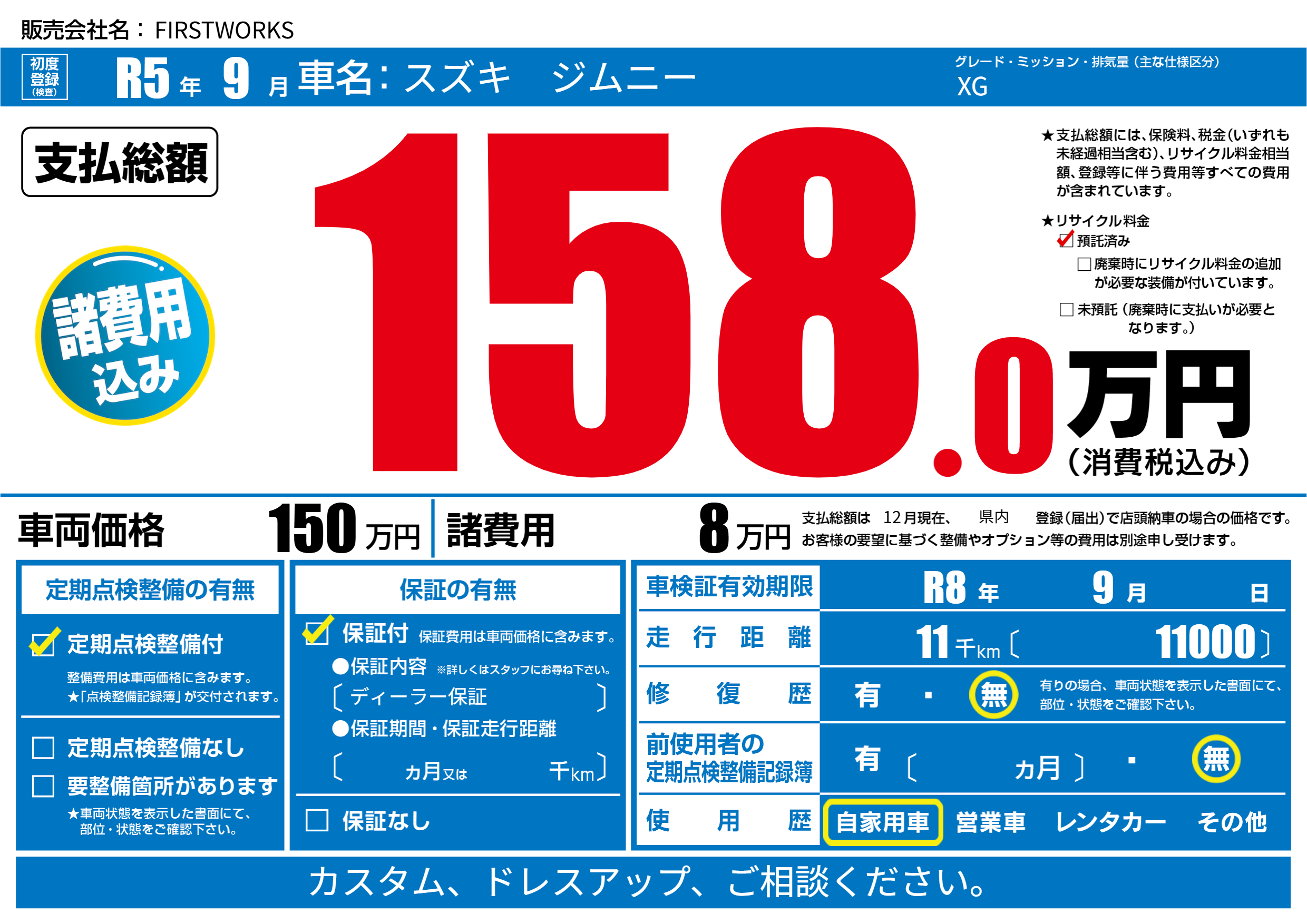 | 走行キロ | 1.1万km | 初年度登録 | R5年9月 |