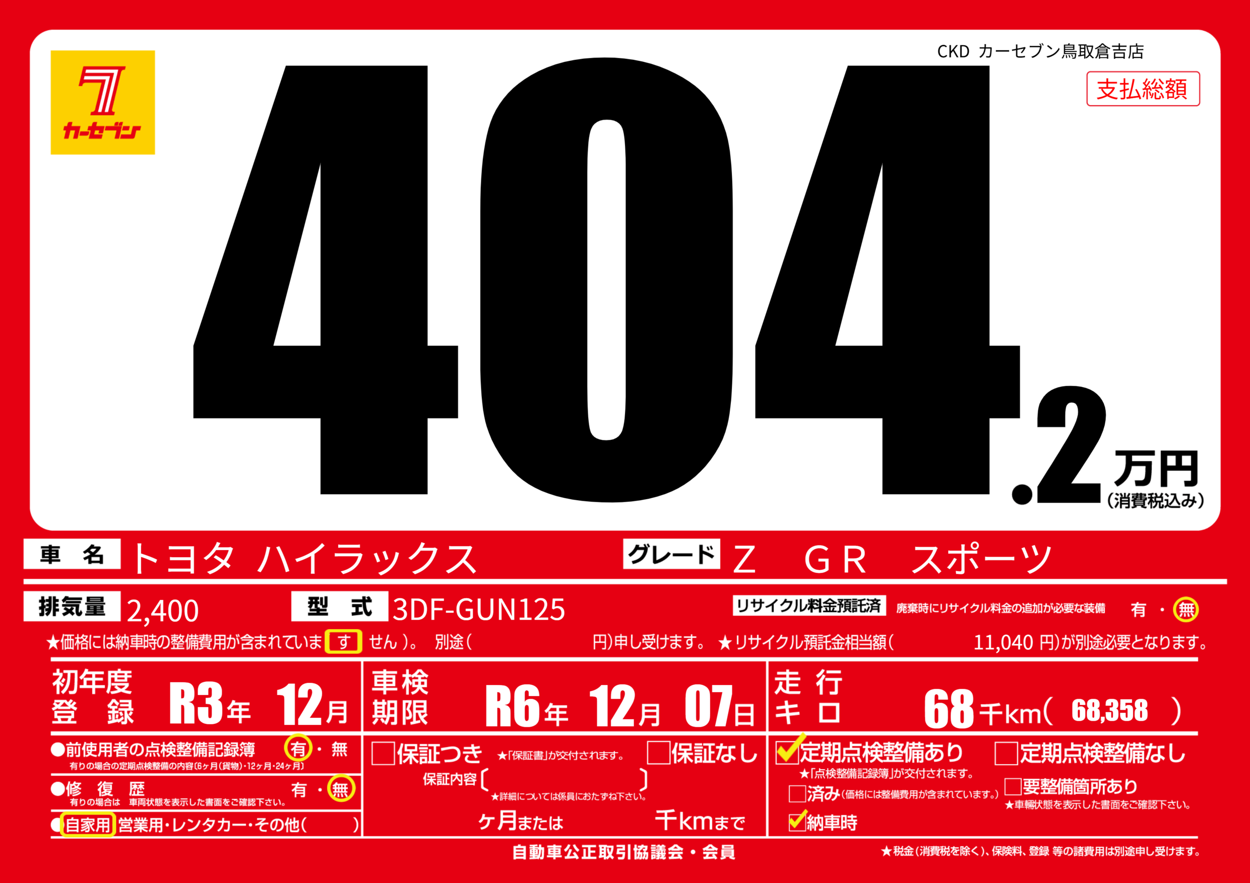 | 走行キロ | 6.8万km | 初年度登録 | R3年12月 |
