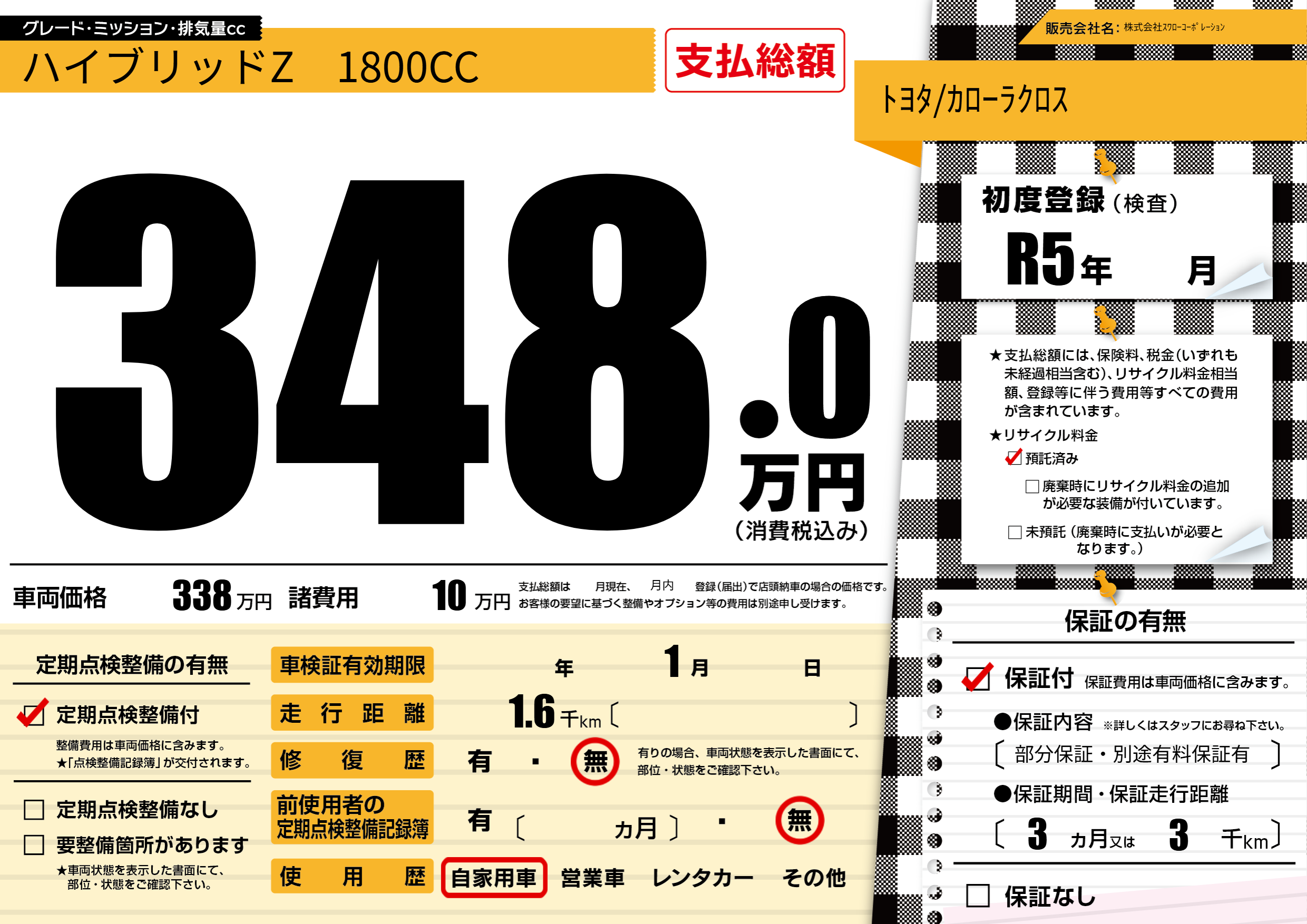 | 車名 | トヨタ/カローラクロス | グレード ミッション 排気量 |
