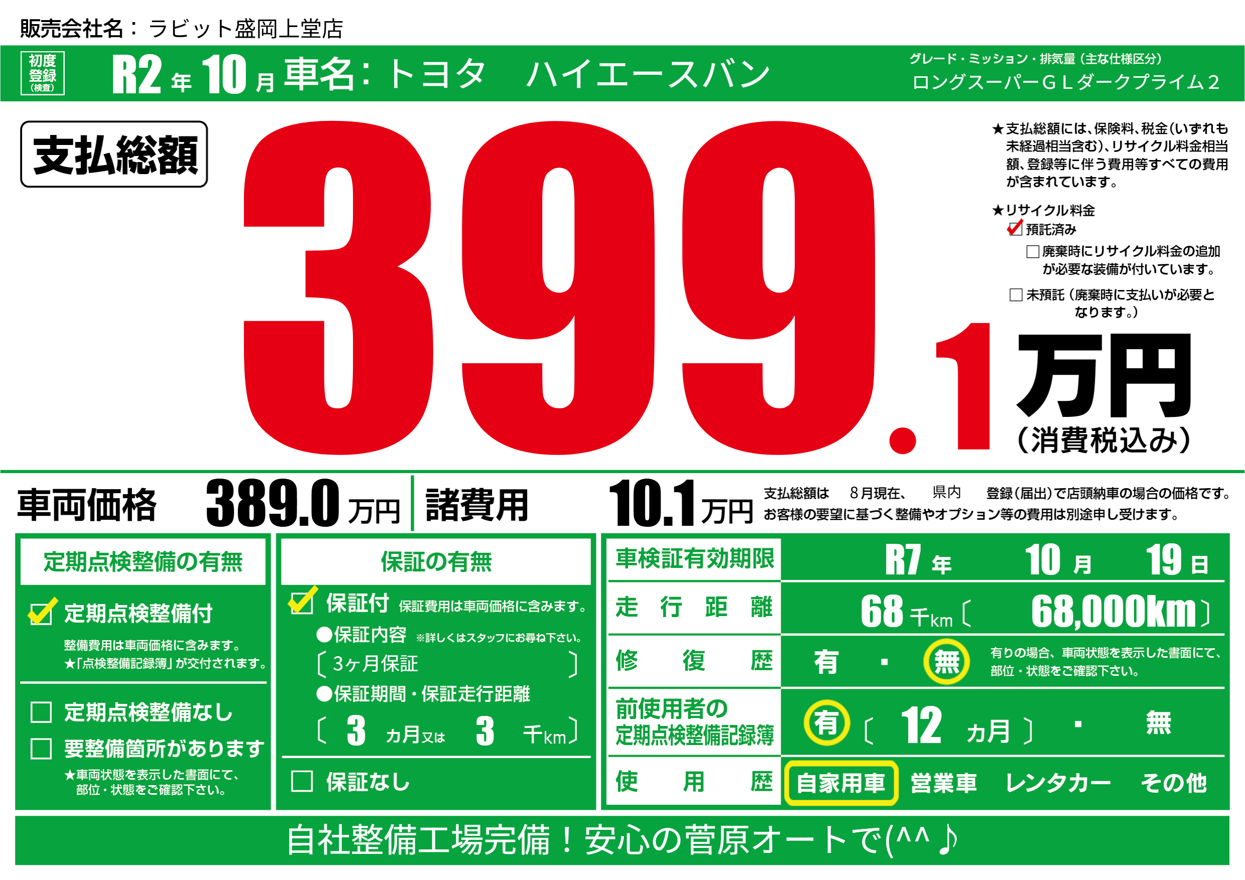 | 車名 | トヨタ ハイエースバン | グレード ミッション 排気量 |