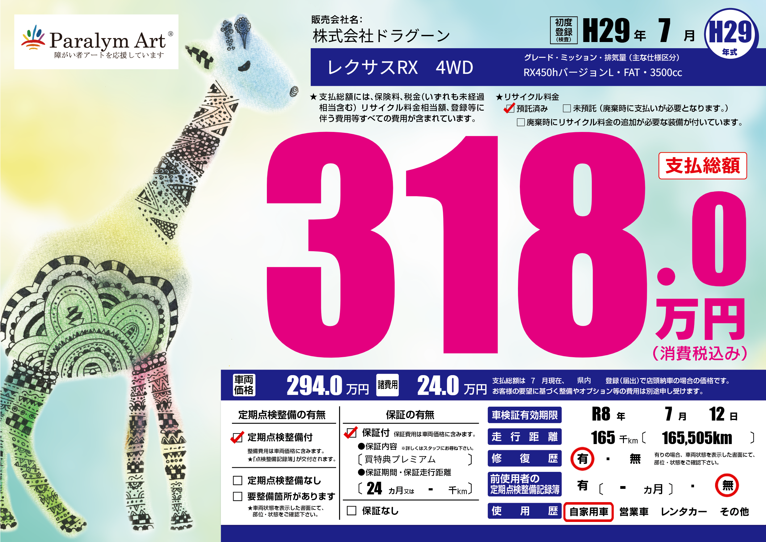 | 車名 | レクサスRX 4WD | グレード ミッション 排気量 |