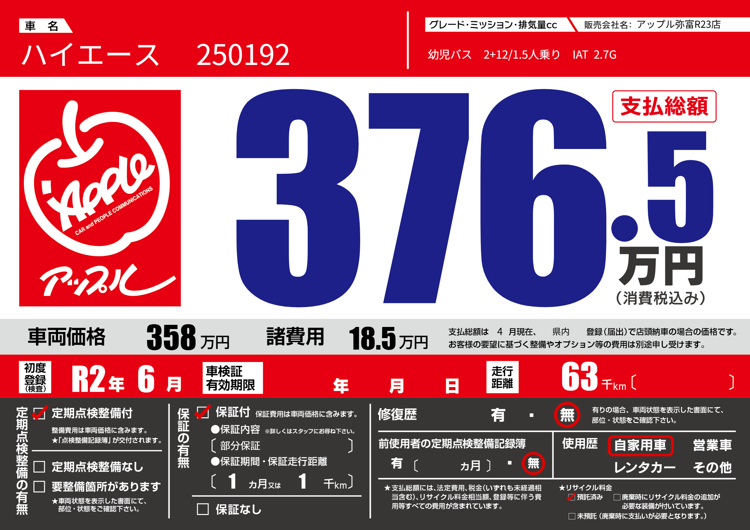 | 車名 | ハイエース 250192 | グレード ミッション 排気量 |