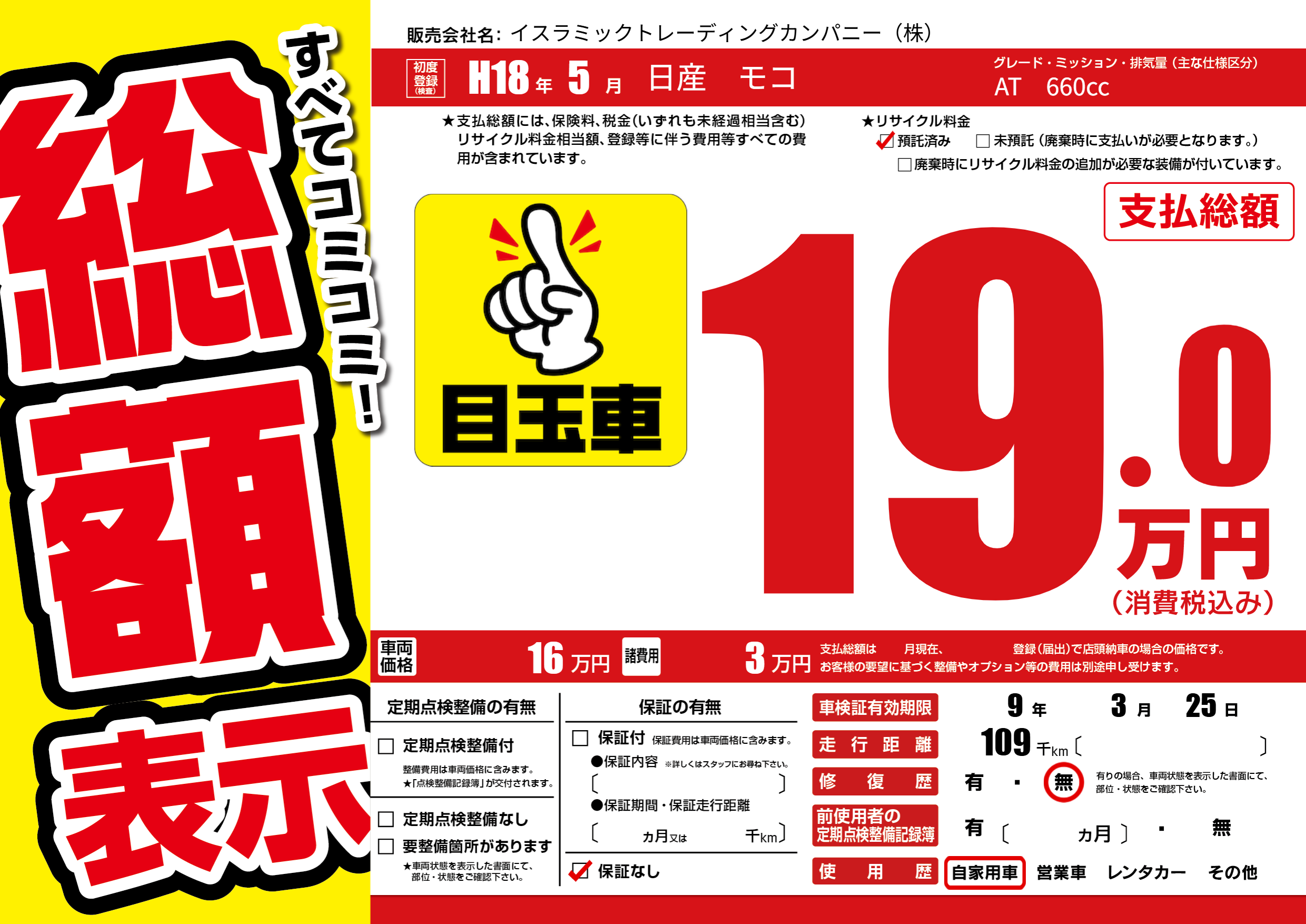 | 車名 | 日産 モコ | グレード ミッション 排気量 |