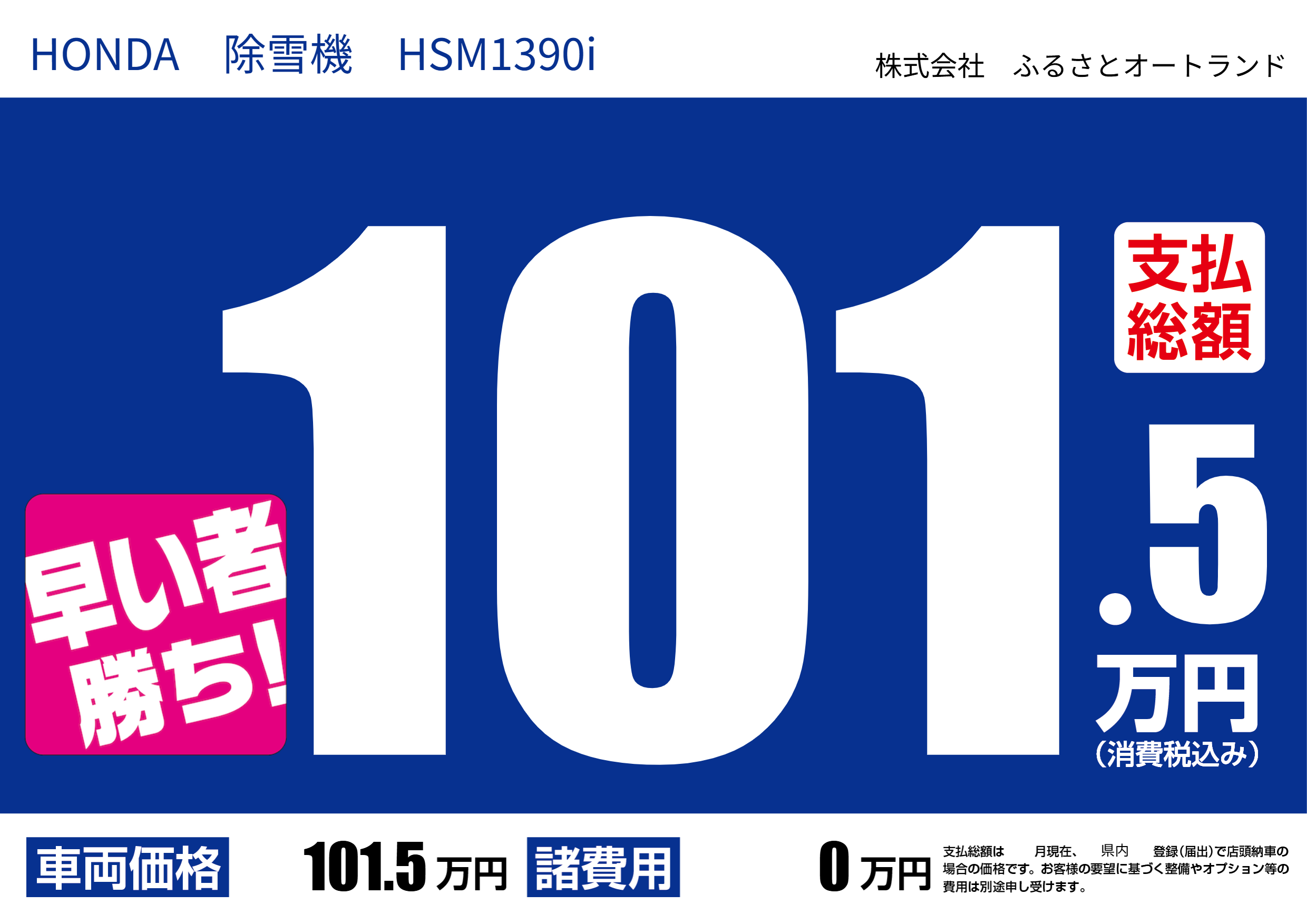 | 車名 | HONDA 除雪機 HSM1390i | グレード ミッション 排気量 |