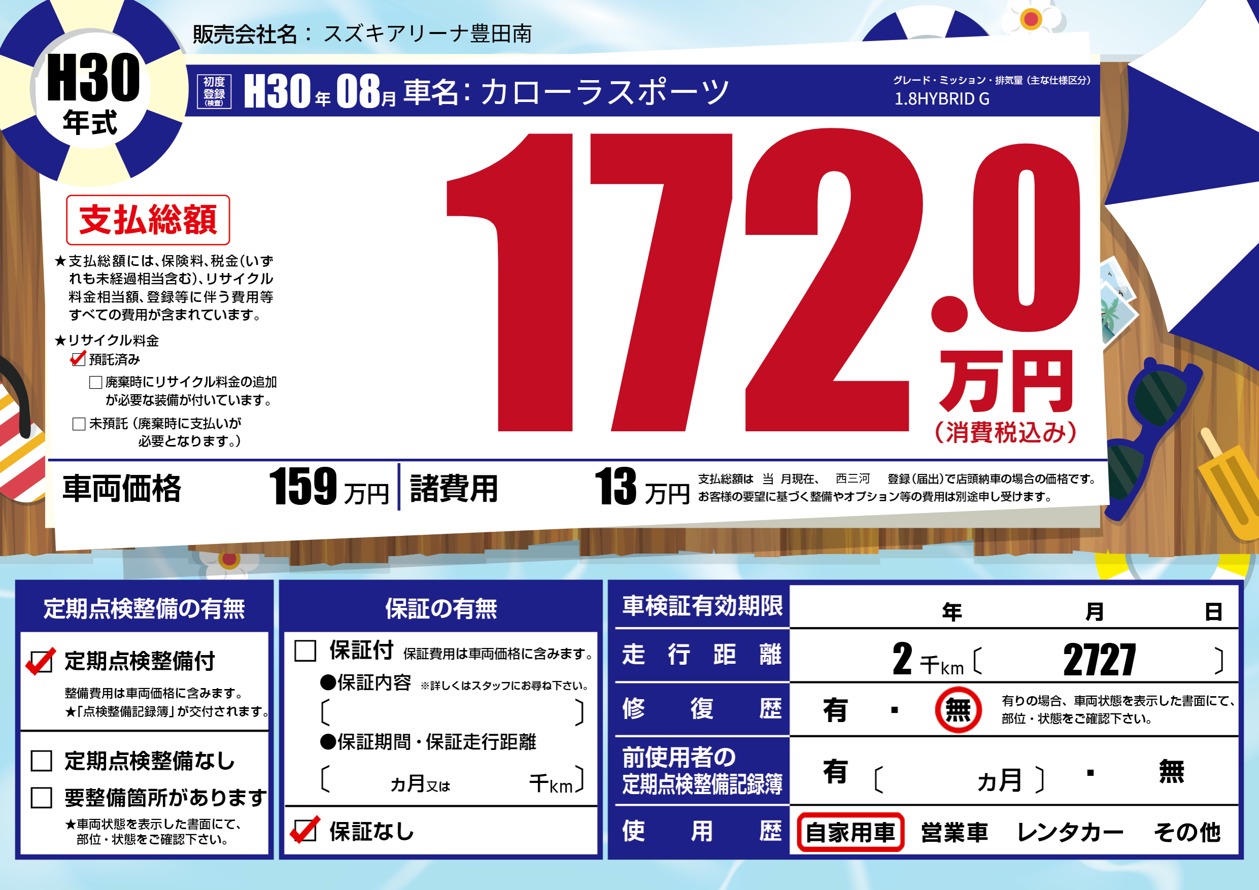 | 走行キロ | 0.2万km | 初年度登録 | H30年08月 |