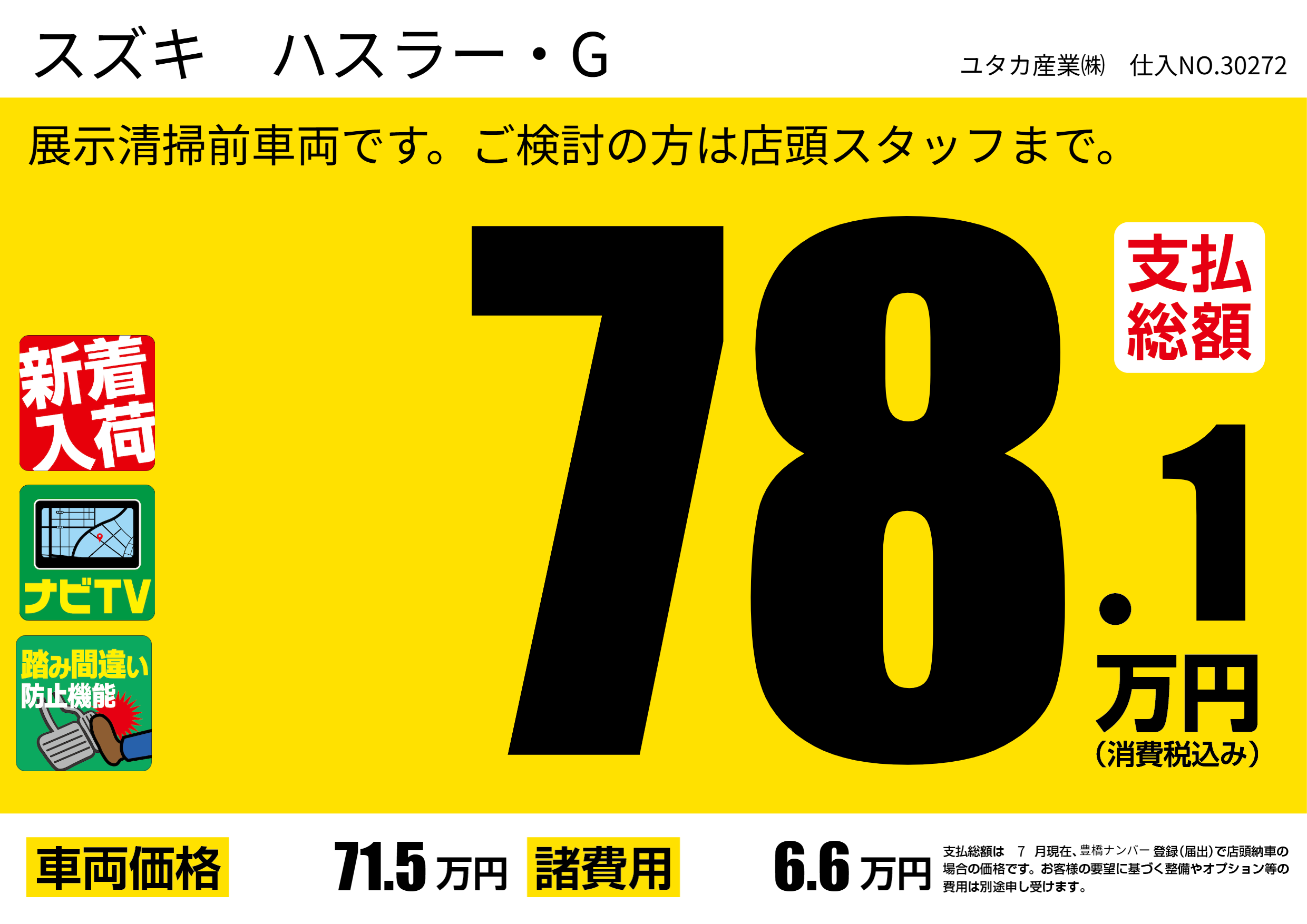 | 車名 | スズキ ハスラー・G | グレード ミッション 排気量 |