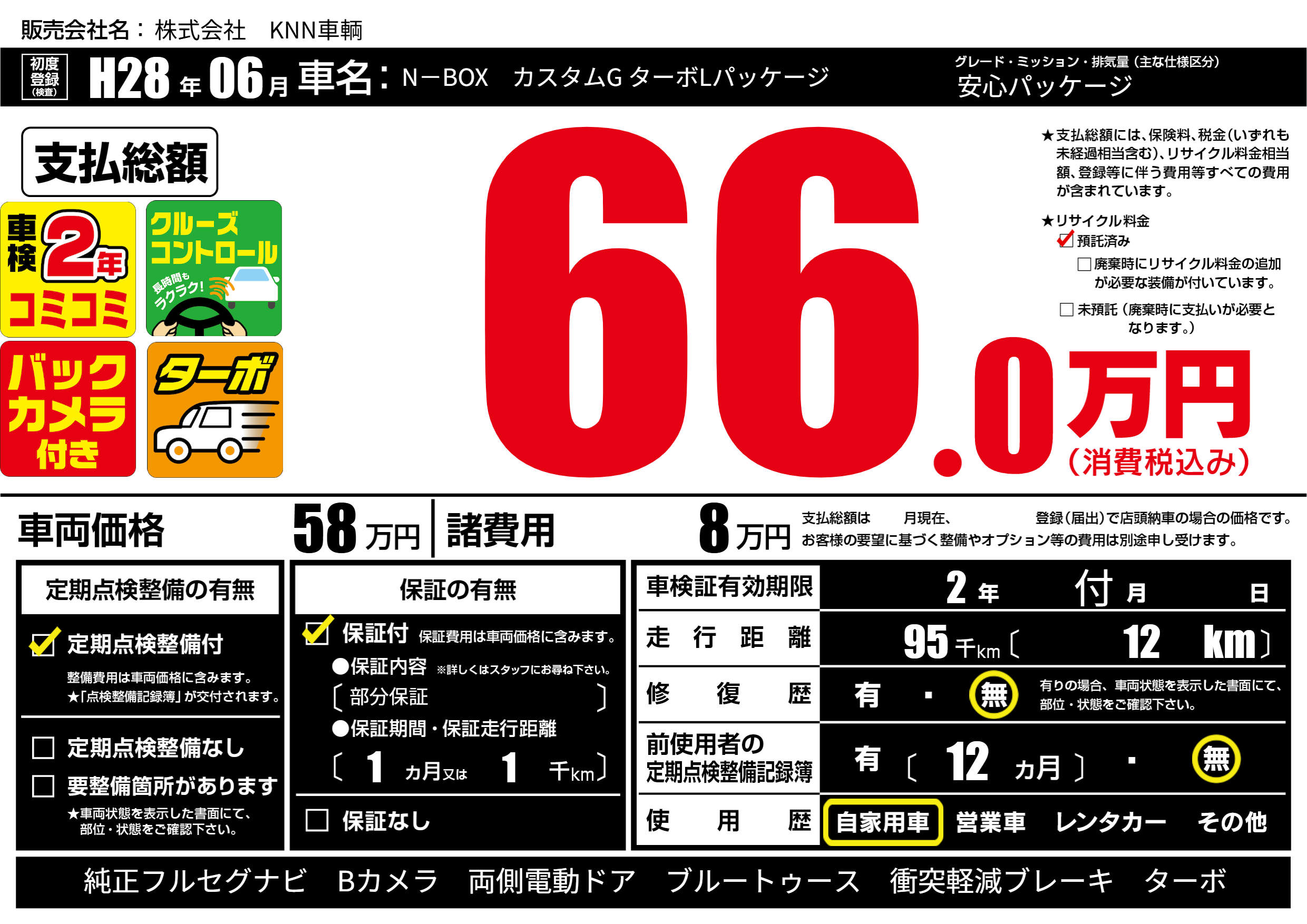 | 車名 | N-BOX カスタムG ターボLパッケージ | グレード ミッション 排気量 |