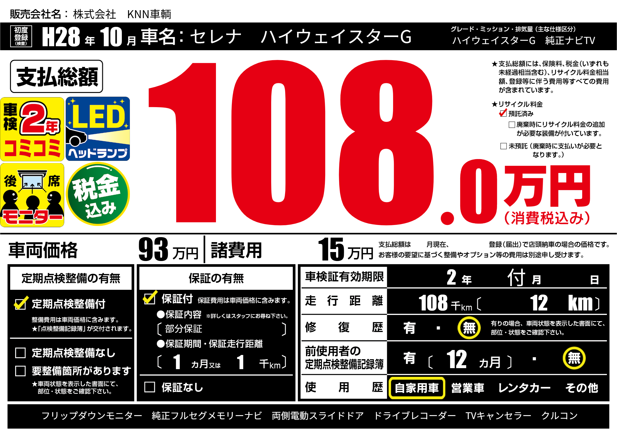 | 走行キロ | 10.8万km | 初年度登録 | H28年10月 |