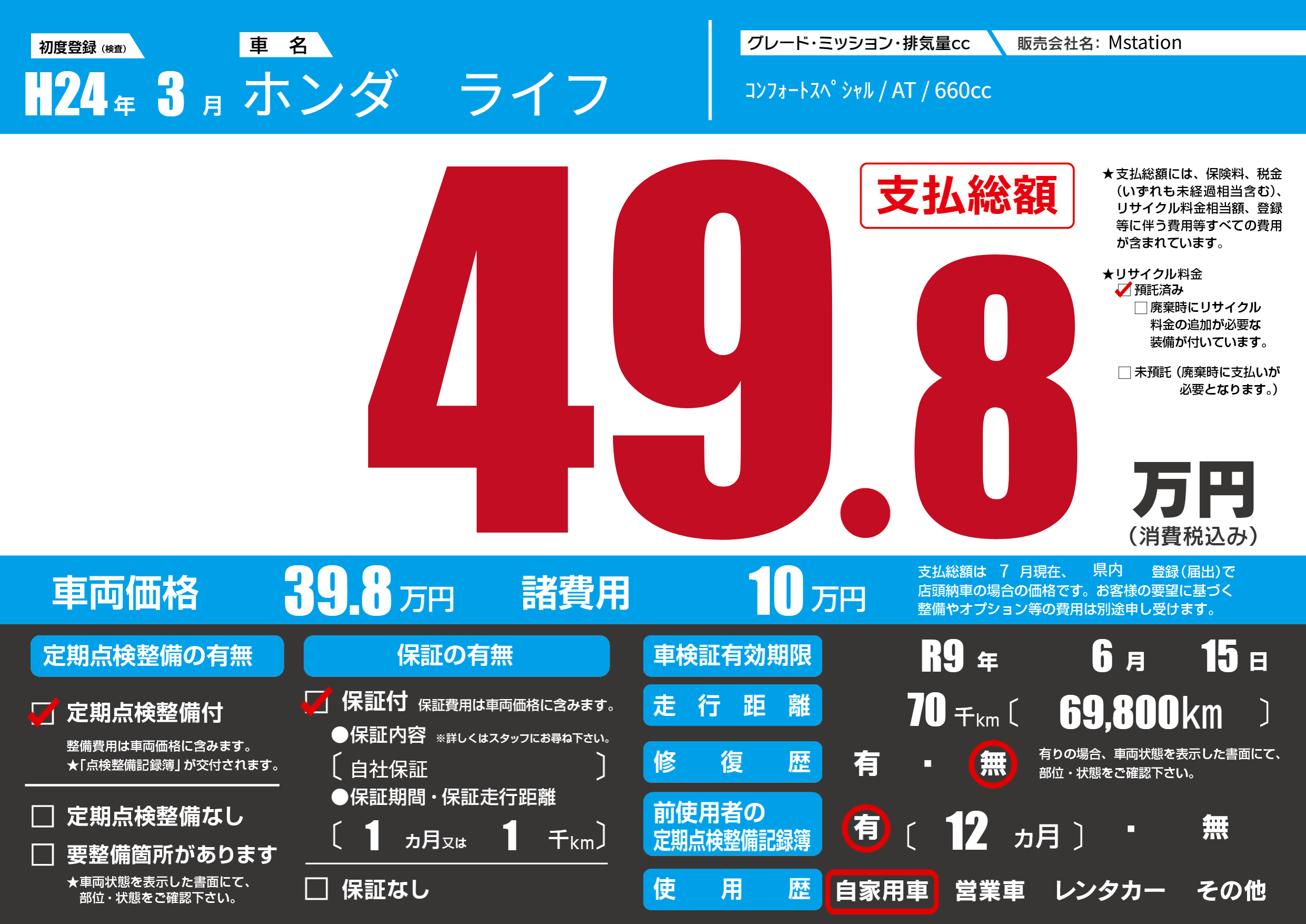 | 走行キロ | 7万km | 初年度登録 | H24年3月 |