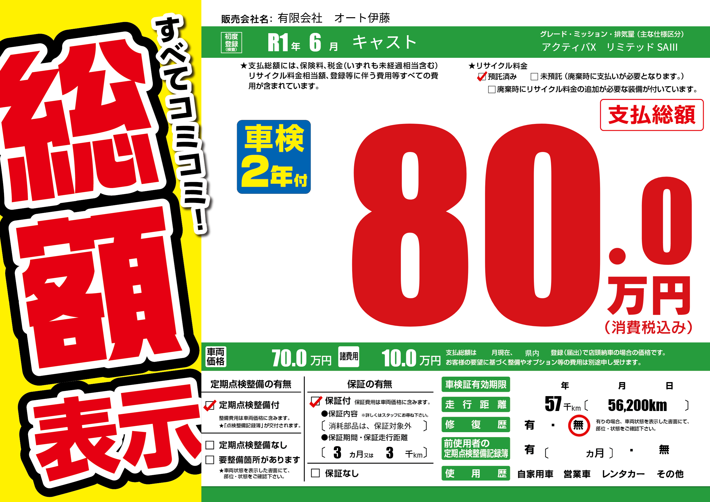保証付き 保証内容(消耗部品は、保証対象外) 3ヶ月または3千km |