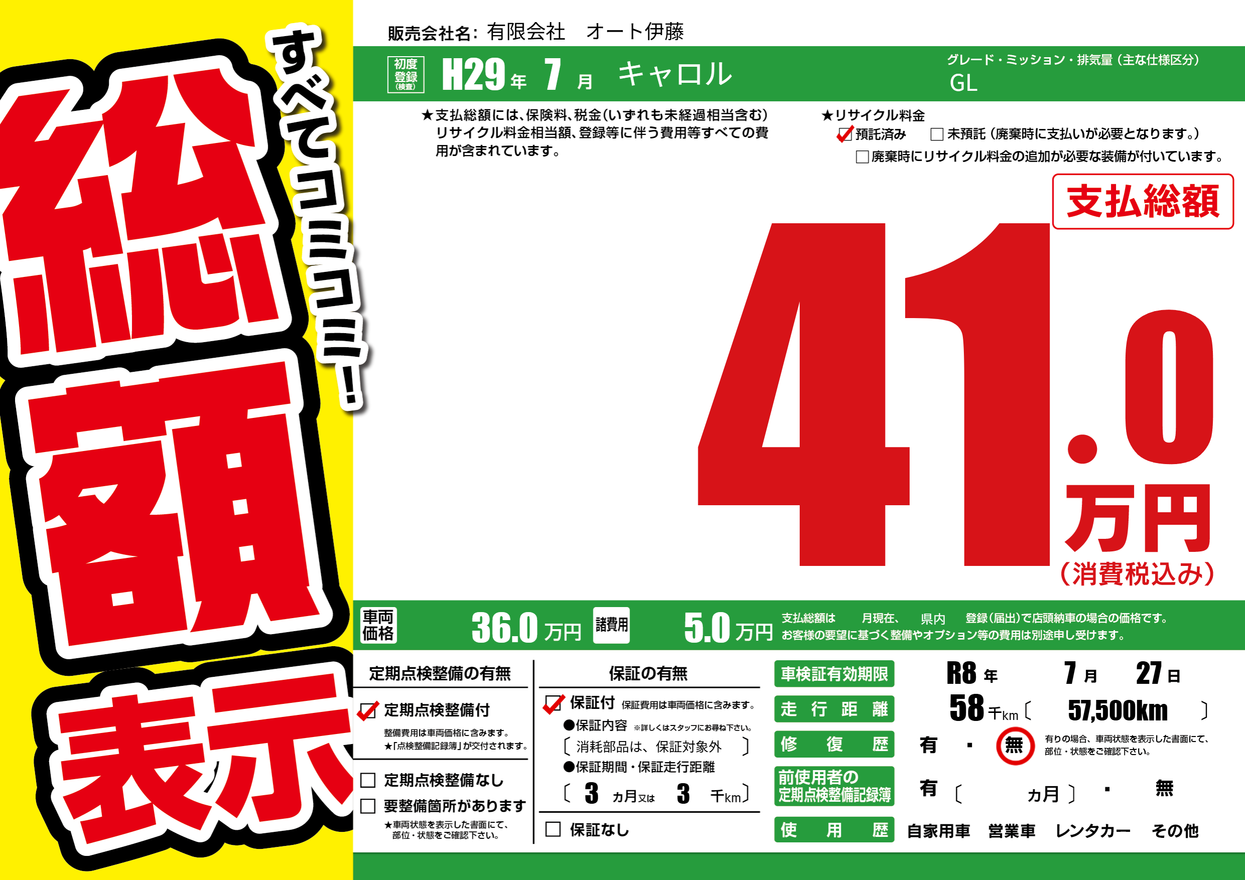 | 車名 | キャロル | グレード ミッション 排気量 |