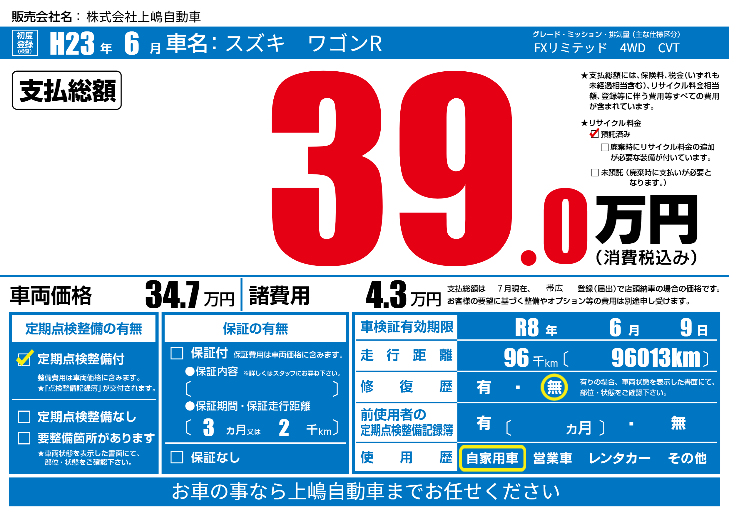 | 走行キロ | 9.6万km | 初年度登録 | H23年6月 |