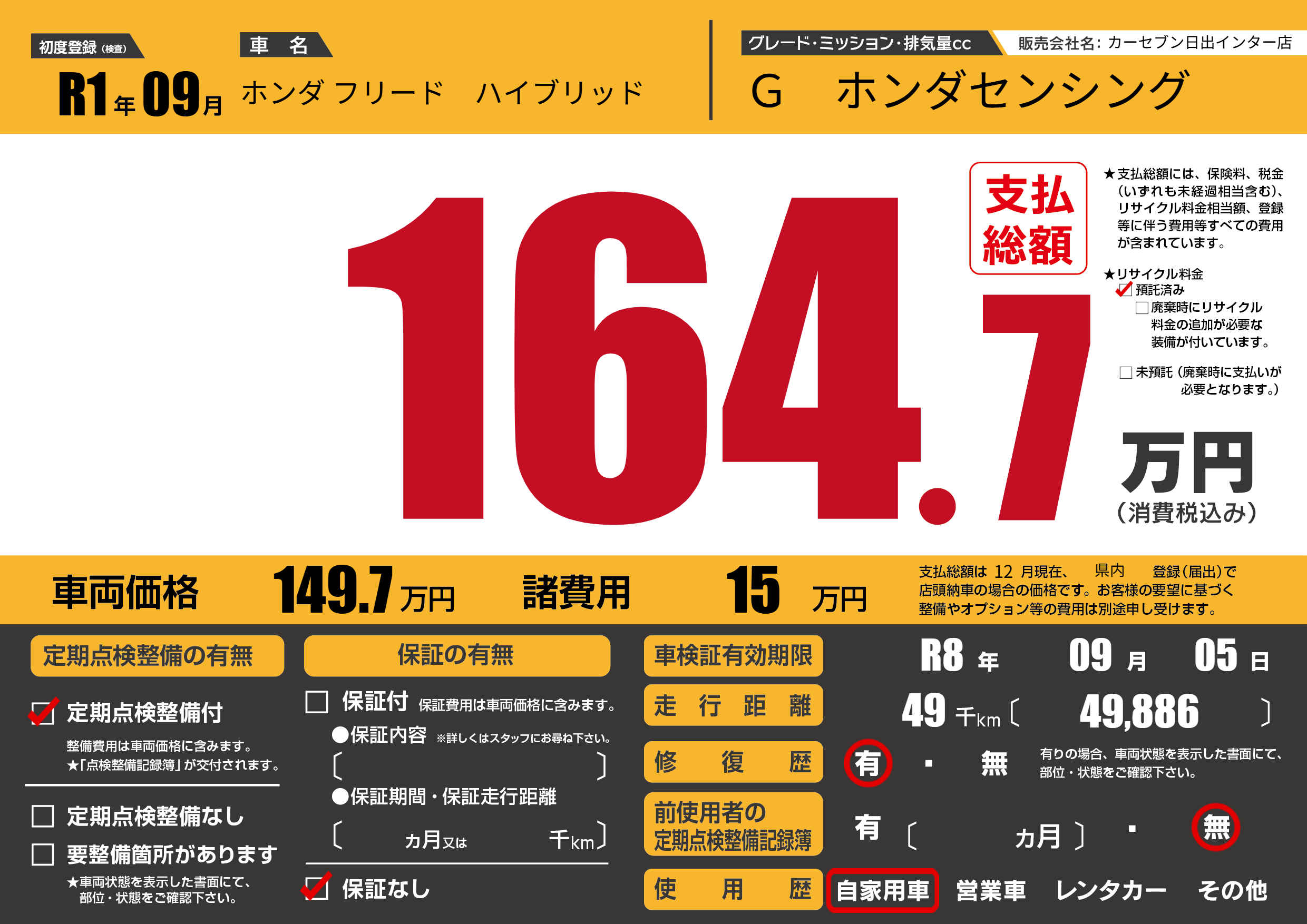 | 車名 | ホンダ フリード ハイブリッド | グレード ミッション 排気量 |