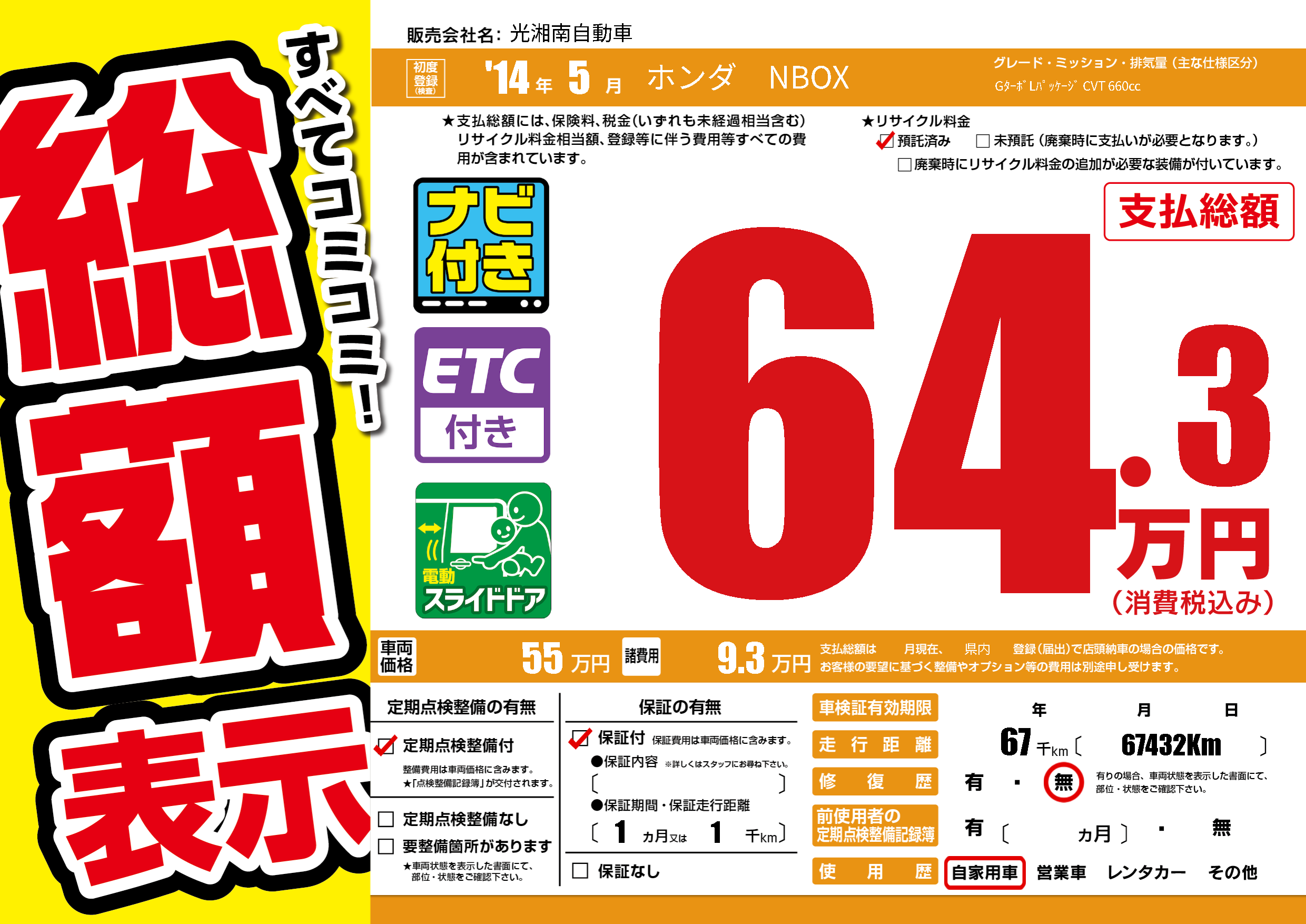 | 車名 | ホンダ NBOX | グレード ミッション 排気量 |