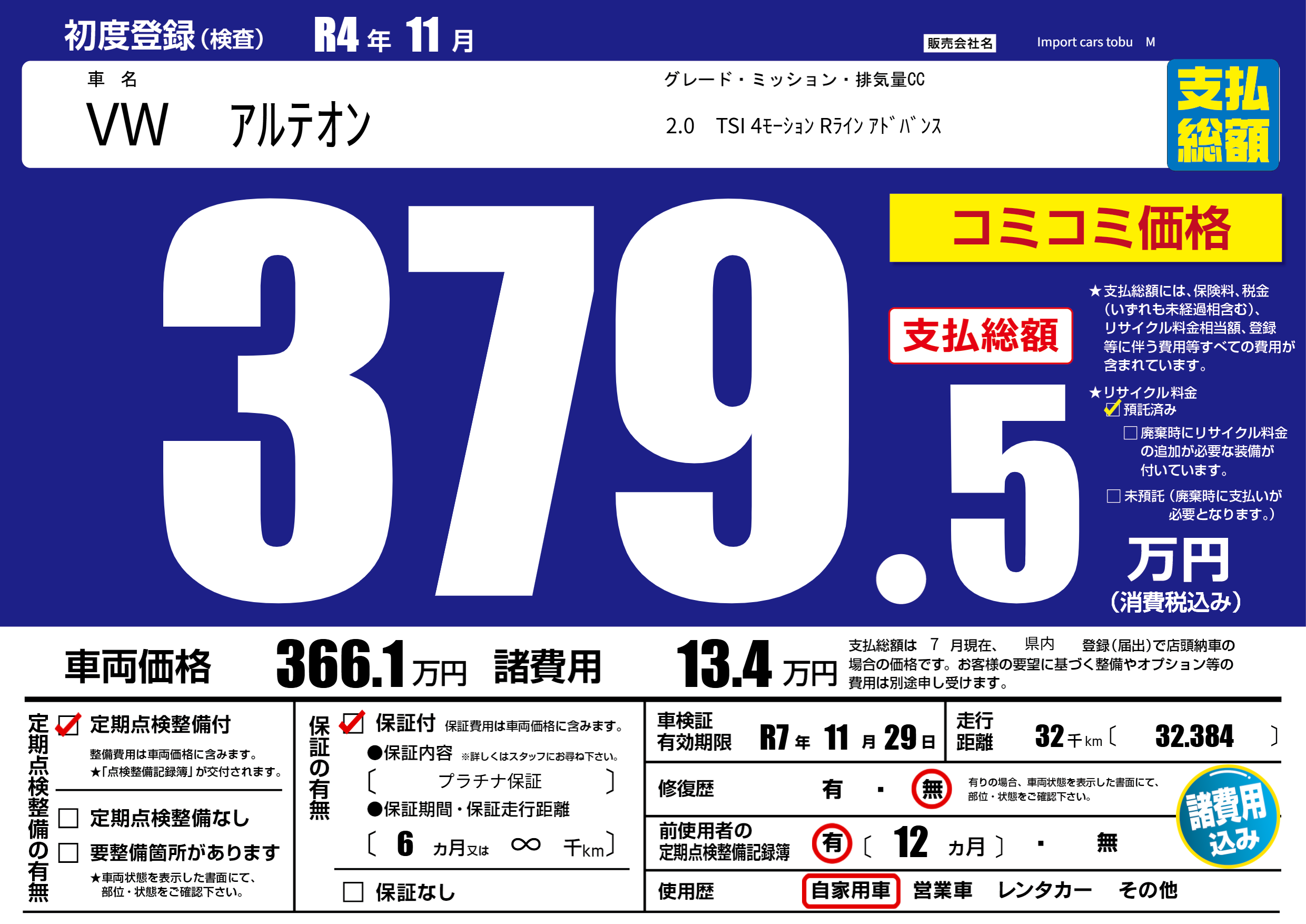 | 車名 | VW アルテオン | グレード ミッション 排気量 |