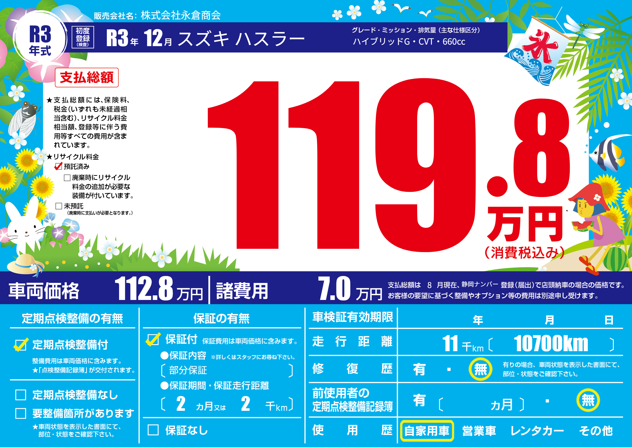 | 車名 | スズキ ハスラー | グレード ミッション 排気量 |