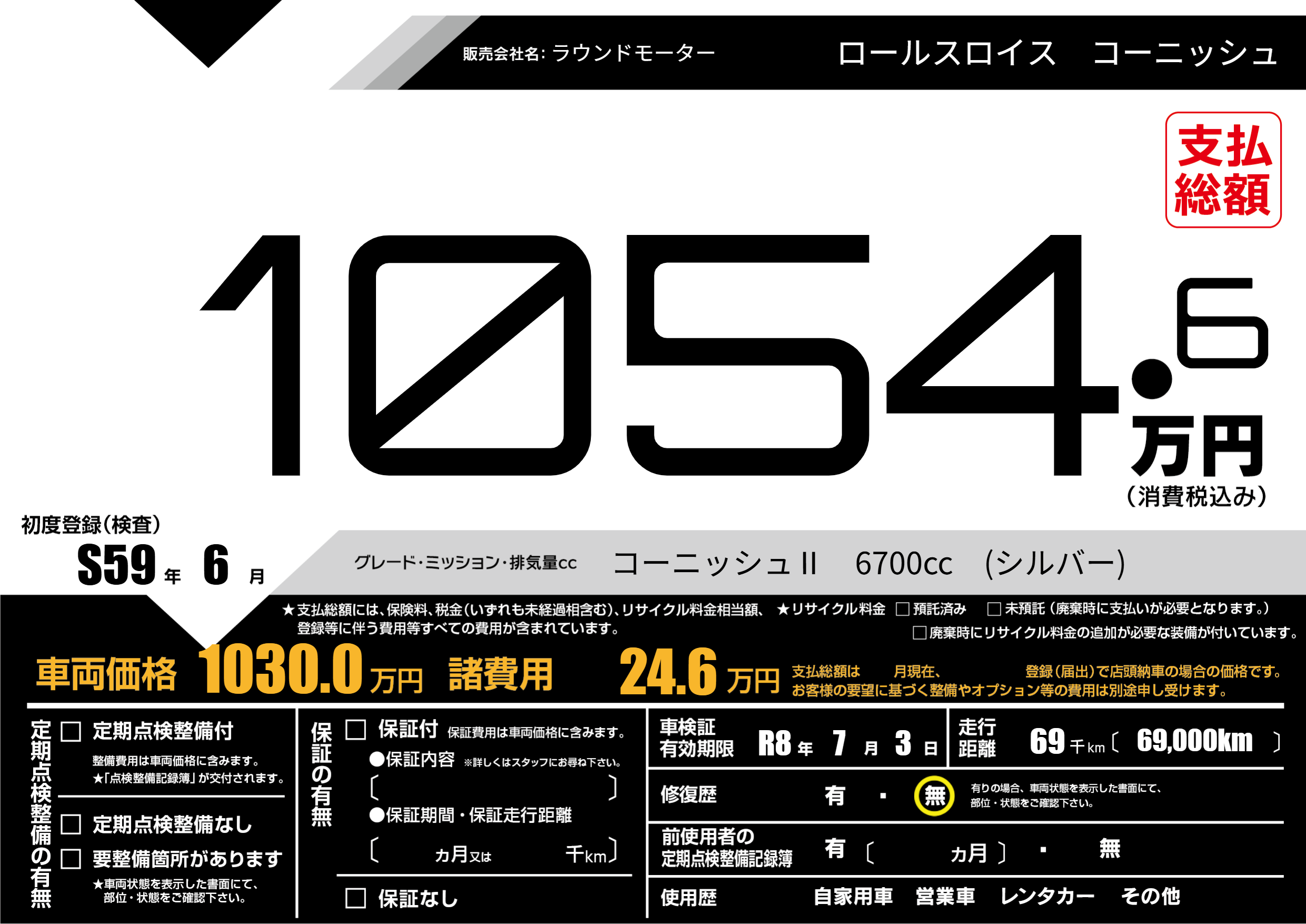 | 車名 | ロールスロイス コーニッシュ | グレード ミッション 排気量 |