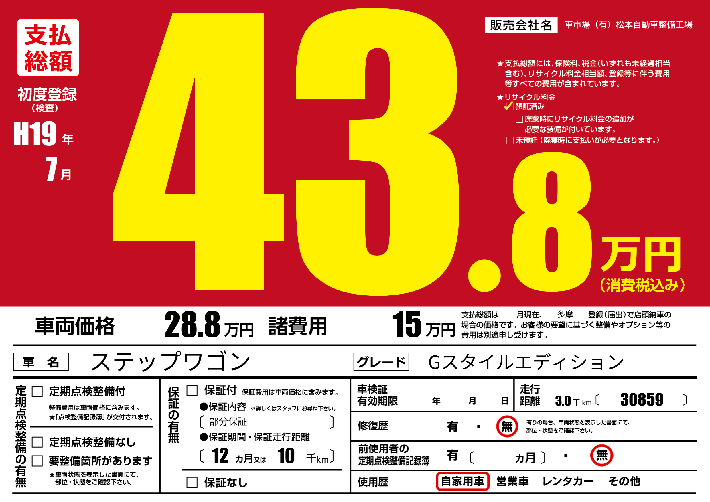 | 走行キロ | 0.3万km | 初年度登録 | H19年7月 |