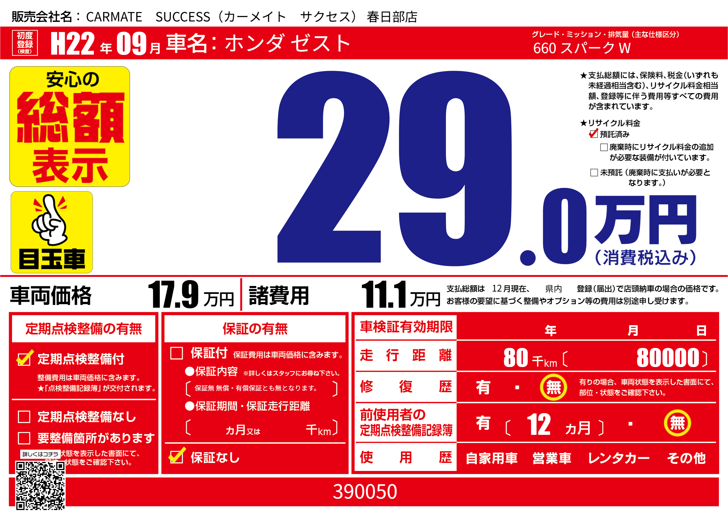 | 走行キロ | 8万km | 初年度登録 | H22年09月 |