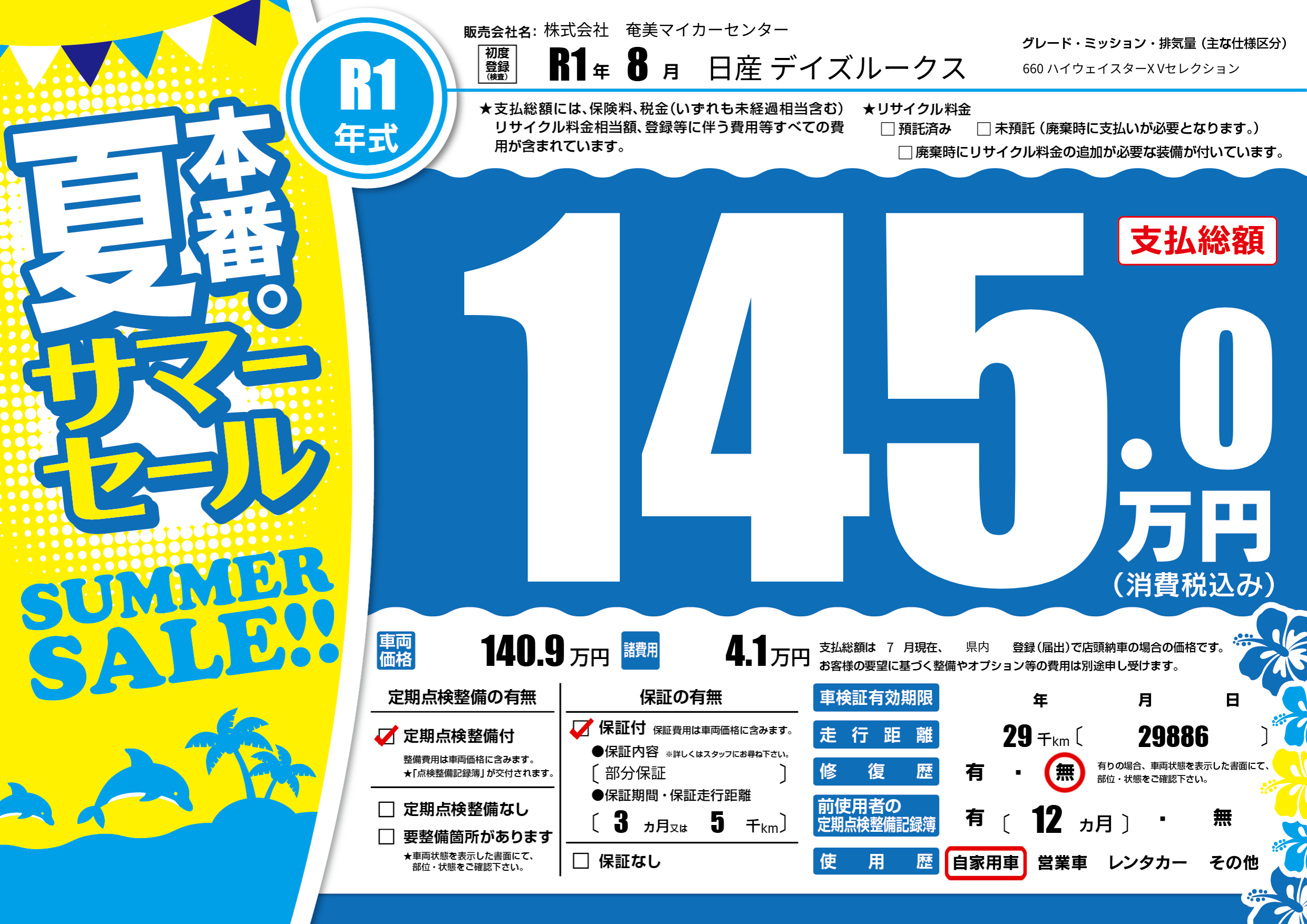| 走行キロ | 2.9万km | 初年度登録 | R1年8月 |