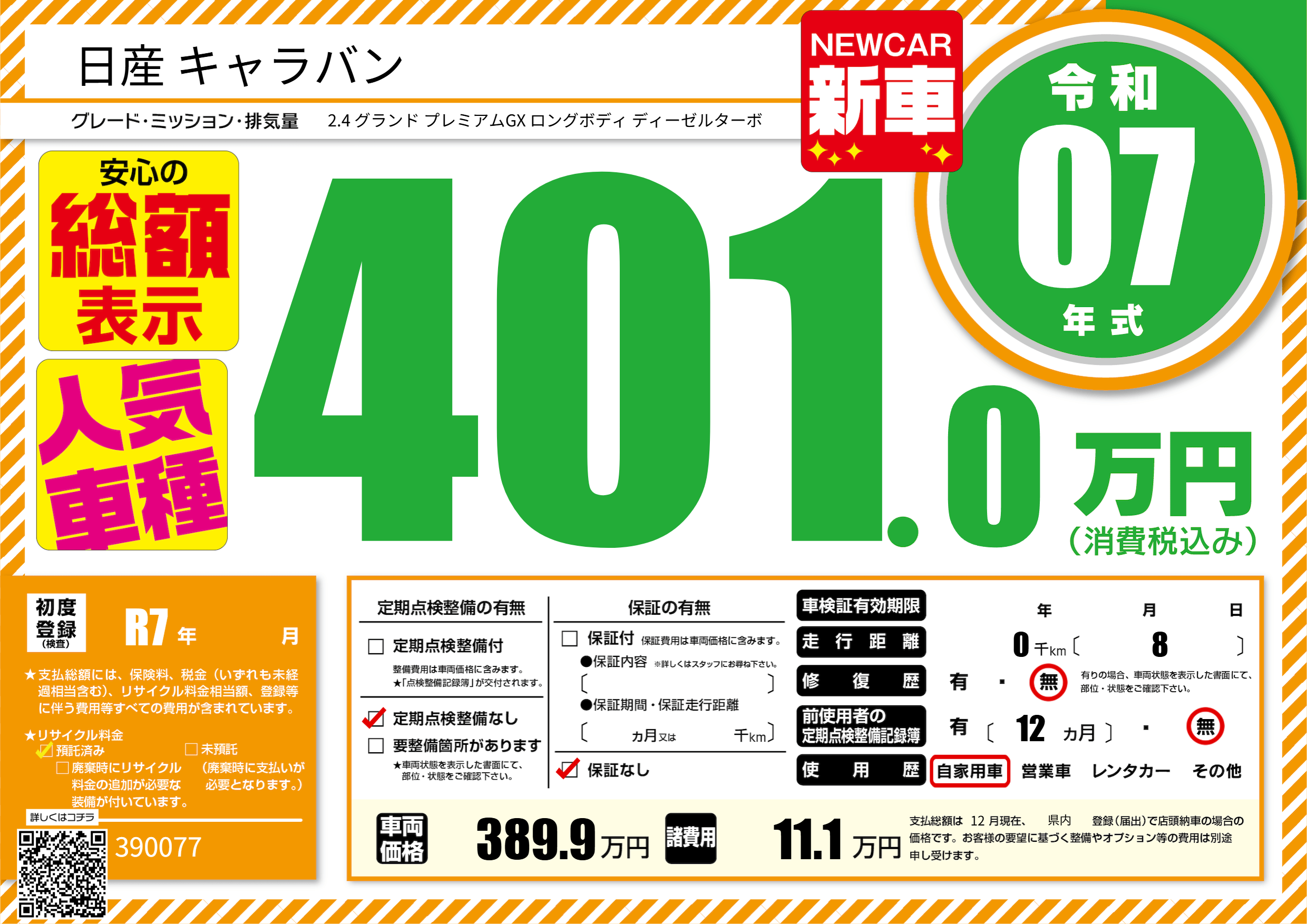 | 走行キロ | - | 初年度登録 | R7年---月 |