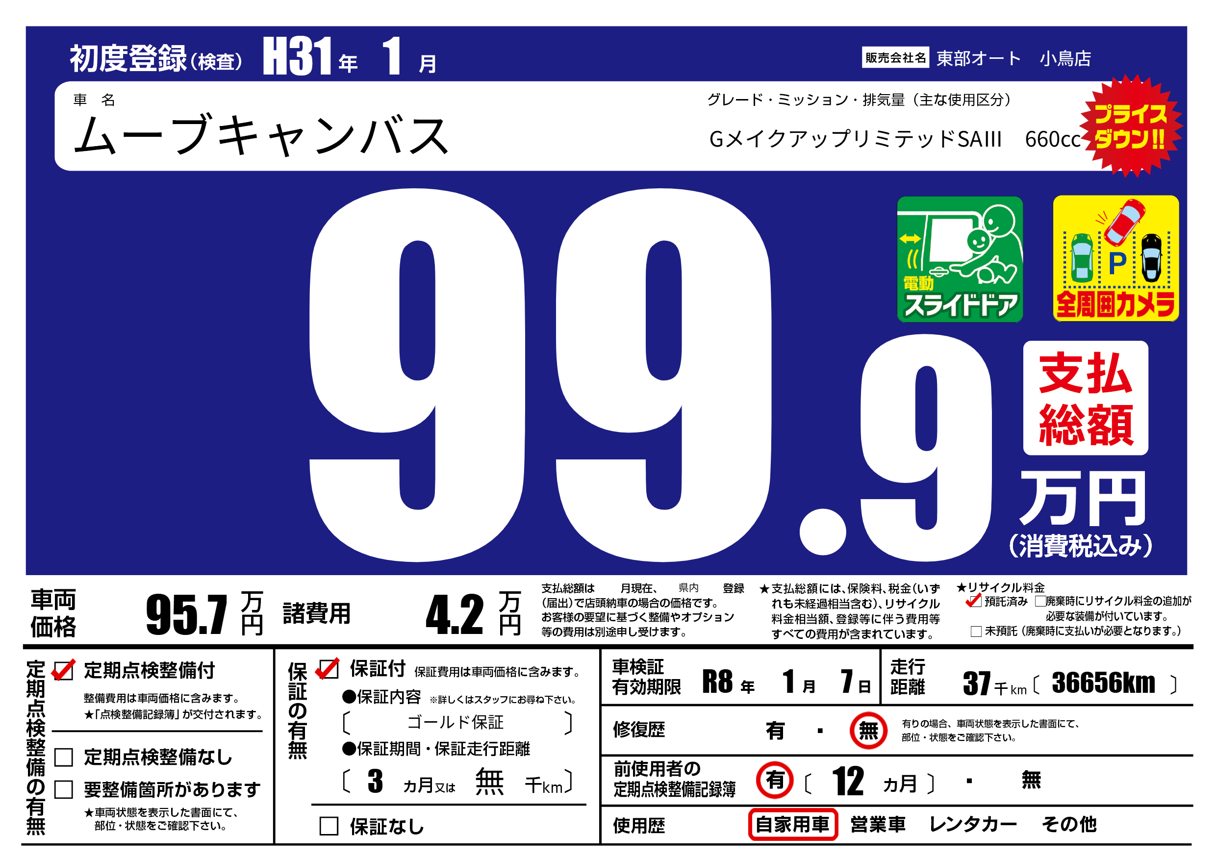 | 走行キロ | 3.7万km | 初年度登録 | H31年1月 |