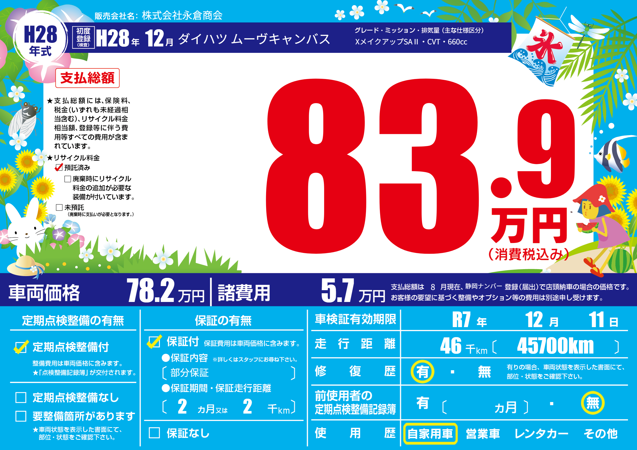 | 走行キロ | 4.6万km | 初年度登録 | H28年12月 |