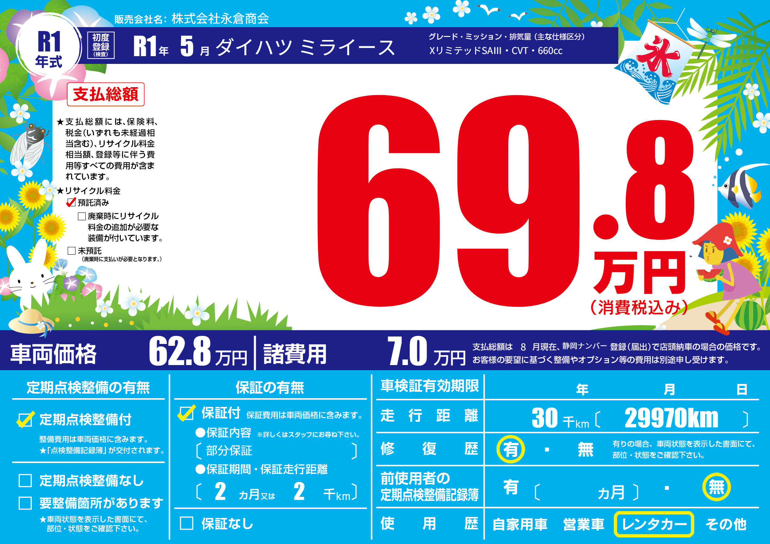 | 走行キロ | 3万km | 初年度登録 | R1年5月 |