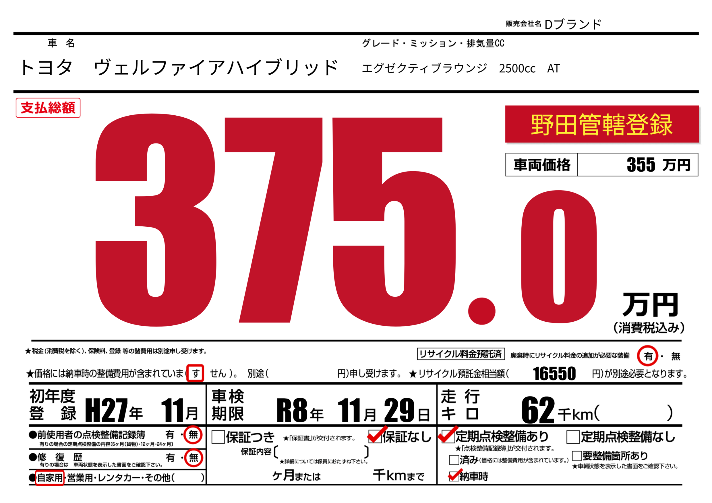 | 車名 | トヨタ ヴェルファイアハイブリッド | グレード ミッション 排気量 |