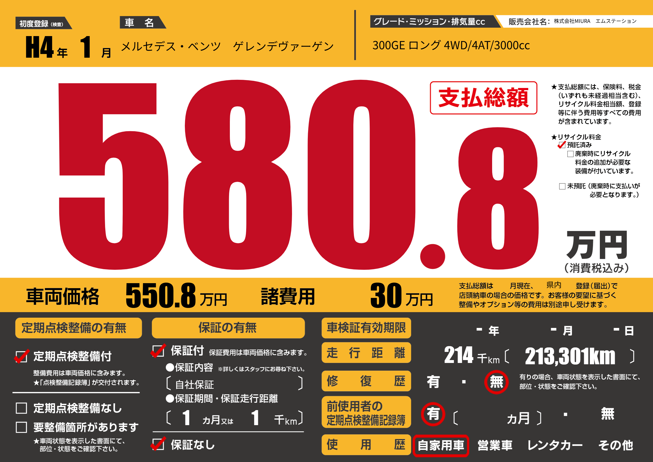 | 車名 | メルセデス・ベンツ ゲレンデヴァーゲン | グレード ミッション 排気量 |