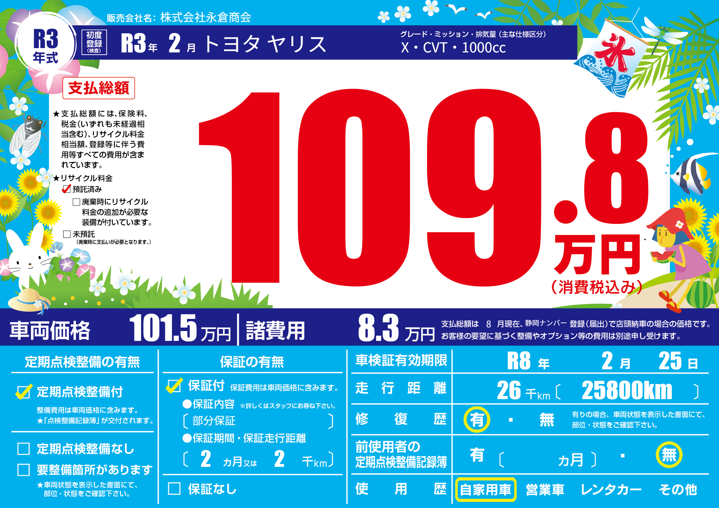 | 走行キロ | 2.6万km | 初年度登録 | R3年2月 |